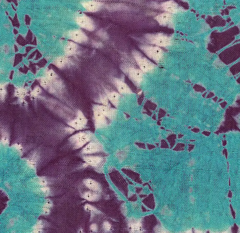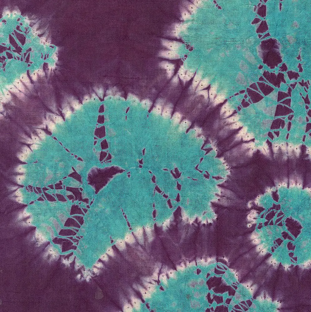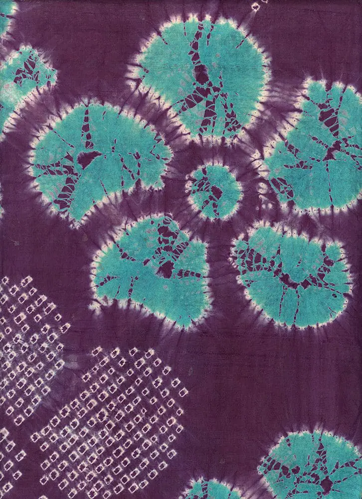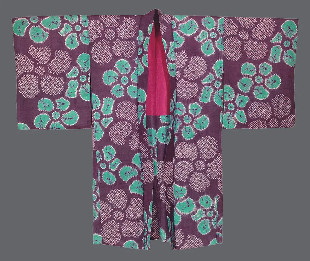 The plum blossom holds special significance in Japanese culture as a symbol of perseverance, hope, and renewal, blooming courageously through the late winter snow to herald spring's arrival. The "nejiumo" or twisted plum motif specifically celebrates this resilience through its spiraling forms that suggest both the flower's natural growth and the cyclical nature of seasonal change. The bold color palette of complementary purples and greens, enhanced by the crisp white resist areas, demonstrates the period's embrace of optimistic, life-affirming designs. The sophisticated shibori work, with its precise binding techniques creating both the floral forms and geometric crosshatched circles, represents the continuation of centuries-old Japanese textile traditions while adapting to contemporary aesthetic sensibilities that favored more dynamic and expressive pattern arrangements.