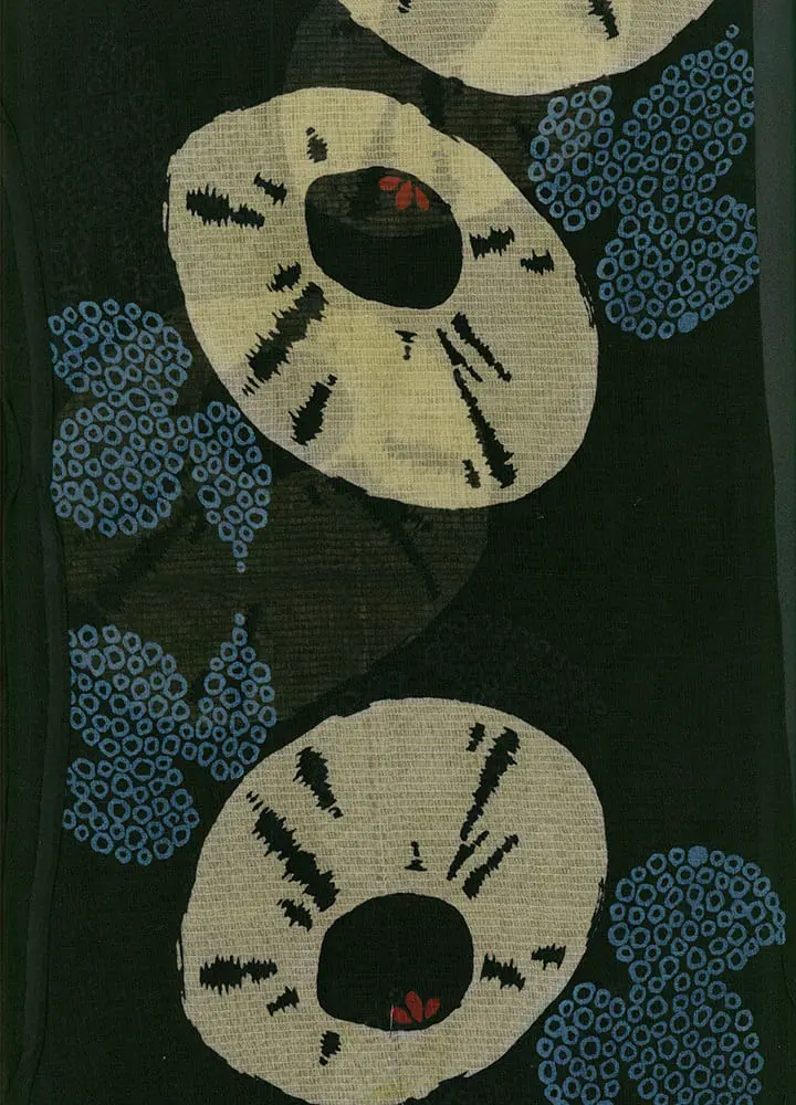 This summer kimono features a bold, all-over pattern of stylized circular motifs in cream and pale yellow against a dark ground, interspersed with distinctive blue dotted clusters that create visual rhythm across the surface. The design demonstrates clear influences from both Art Deco and emerging mid-century modern aesthetics, with its geometric abstraction and sophisticated color palette that moves away from classical naturalistic representations toward a more contemporary graphic sensibility.