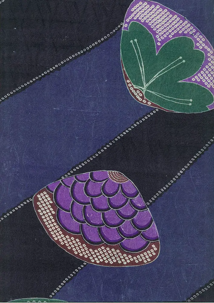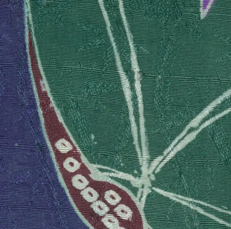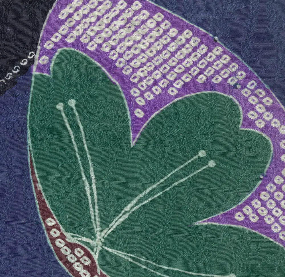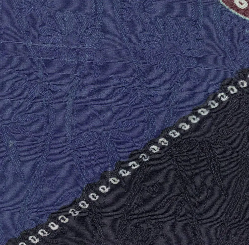 This silk textile is truly exceptional, showcasing a vibrant, beautiful shade of blue. Jigine, a distinctive silk crafted in a specific rural area of Japan, possesses qualities akin to tsumugi silk but with a notably softer texture. Its billowy nature and natural slubs, attributed to the use of tussah silk in the weaving process, add unique character. The fabric features an exquisite undulating wave motif called tatewaku against a backdrop adorned with stunning jewel-toned clams. It's important to note that the dots, known as kanoko, emulate the appearance of shibori through a screening process. The piece is in excellent condition, measuring 14.5 inches x 50 inches (37 cm x 127 cm).