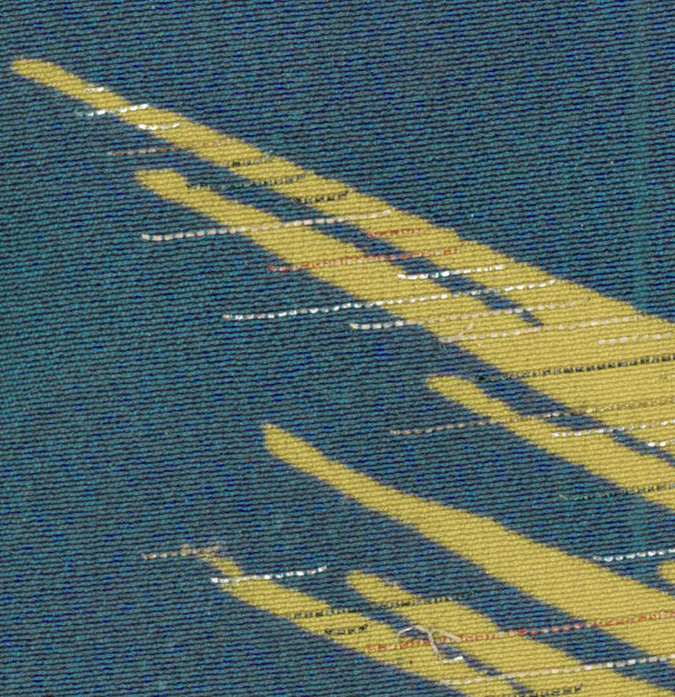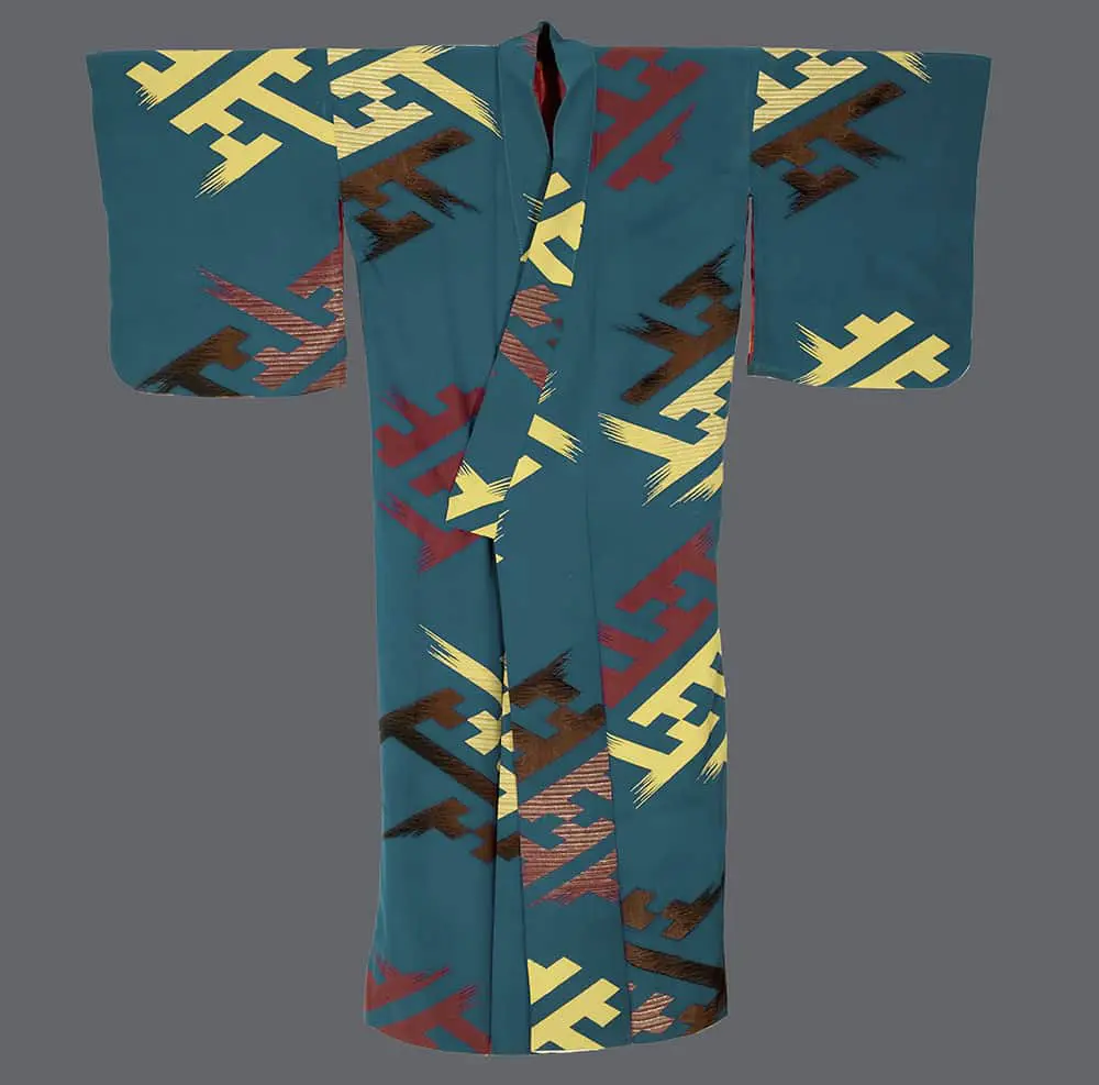 The close-up details reveal the sophisticated technical execution, where approximately half the motifs are enhanced with supplementary urushi-coated threads that create lustrous, lacquer-like surfaces in contrasting colors. This innovative technique combines traditional Japanese lacquer artistry with textile production, resulting in motifs that appear to float above the silk ground with dimensional brilliance. The urushi threads not only add visual richness but also symbolic weight, as lacquer in Japanese culture represents durability, protection, and refinement. The geometric fragmentation and bold color contrasts suggest influences from Western avant-garde movements while maintaining distinctly Japanese sensibilities in the interplay of materials and the overall compositional balance. This kimono exemplifies the experimental spirit of early 20th-century Japanese textile artists who successfully merged traditional craft techniques with international modernist aesthetics.