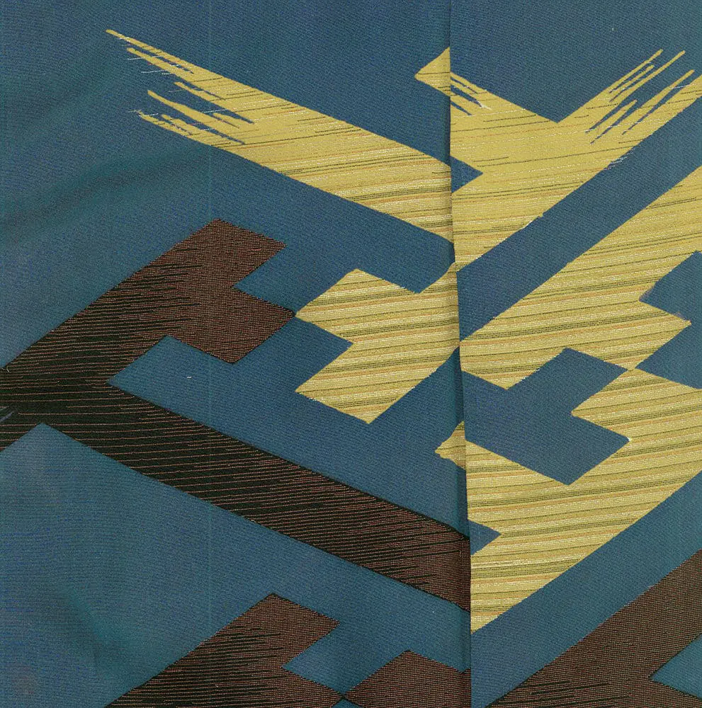 This silk kimono presents a bold example of modernist textile design that draws heavily from the geometric abstraction movement and Art Deco aesthetics. The composition features dynamic angular motifs scattered across a rich teal background, with forms that appear to be stylized interpretations of traditional Japanese elements rendered in vibrant yellow, deep red, and brown. The motifs possess a sense of kinetic energy, as if caught in motion or fragmenting across the surface, reflecting the influence of Futurism and Constructivism on Japanese design during this period.