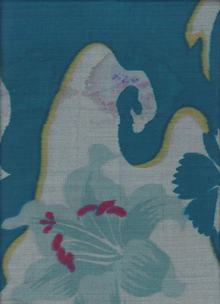 This older vintage (pre-WWII) meisen silk features a medium blue and silver-white hue with a background motif resembling waves or a rolling river, highlighted in a cheerful yellow. Adorning the fabric are sakura florals in white and blue, alongside large turquoise lilies accented with red. As a meisen fabric, it's thinner with a slight crispness. It's in very good condition, though there's a stain present (see detail image). The measurements are 14.25 inches by 64 inches (36 cm x 163 cm).