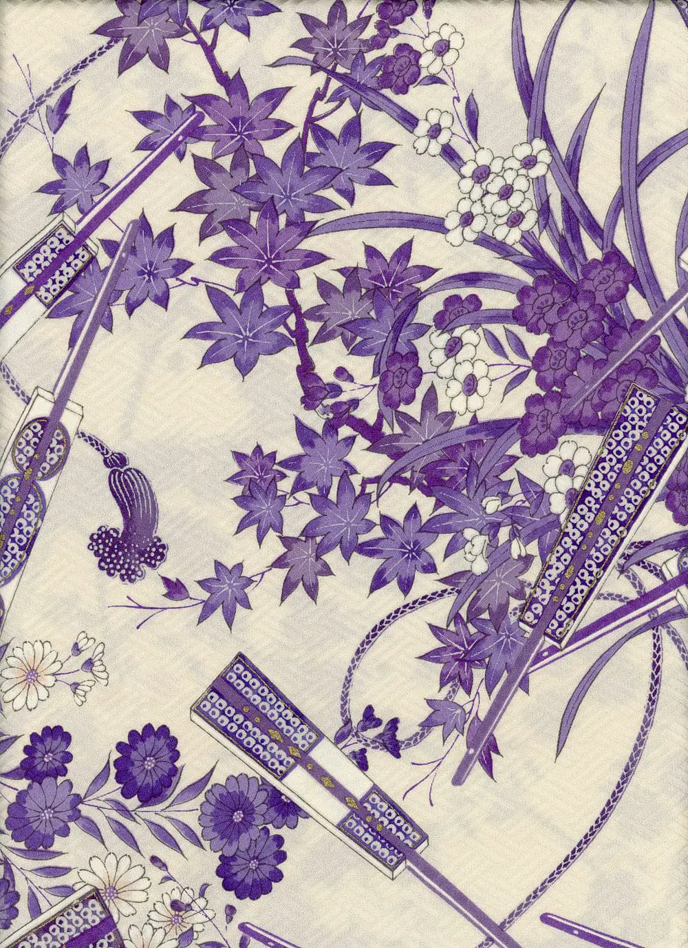 This beautiful creamy rinzu vintage silk features sakura, momiji (maple), and intersecting fans (rectangular paddle-like objects) motifs. Delicately outlined in abundant gold metallic, the motifs adorn a soft, shiny rinzu with a basketweave ground pattern, offering a great drape. It's in excellent condition and measures 14.25 inches by 62 inches (36 cm x 157 cm).