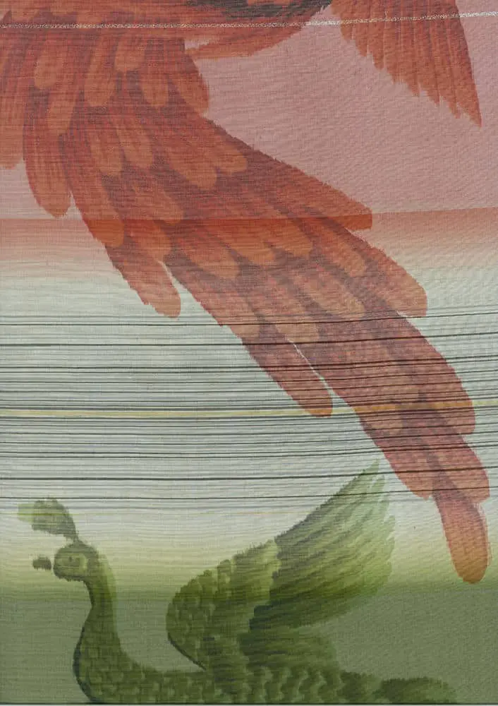 This meisen silk panel, sourced from a vintage Kimono roll and thus remaining unused, showcases striking peacock motifs. One peacock flaunts graduated shades of green, ranging from a lighter, almost lime hue to a deep bottle green, while the other features graduated shades of red against a dusty pink background, transitioning to a deep, almost maroon tone. The space between them displays shades of light cream (within the brown spectrum, not yellowish), embellished with graduated lines in donkey brown, mid-grey, and butter yellow. Additionally, each peacock is adorned with a subtle narrow metallic silver band.