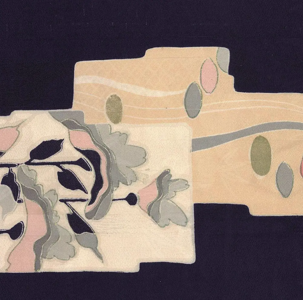 This vintage silk crepe features a dark blue base adorned with a woven bamboo pattern. Delicate floral card motifs in shades of off-white, grey, pink, yellow, and dark blue embellish the fabric. It's a thinner silk with an elegant drape.
