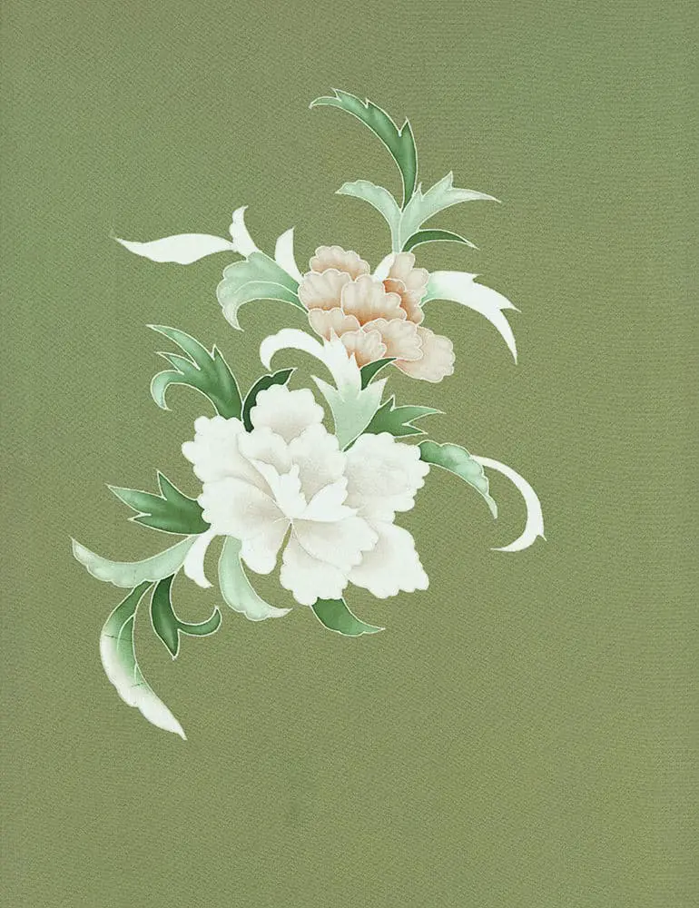 This vintage silk features a delightful pebbly texture in a spring green hue, adorned with flowers in white and melon-orange. It's a soft silk with an excellent drape, preserved in excellent condition. There are subtle mottled areas on the background color, noticeable only if you're specifically looking for them. Additionally, there's a bit of wear on the seam lines. Its measurements are 14.5 inches (37 cm) by 69 inches (175 cm).