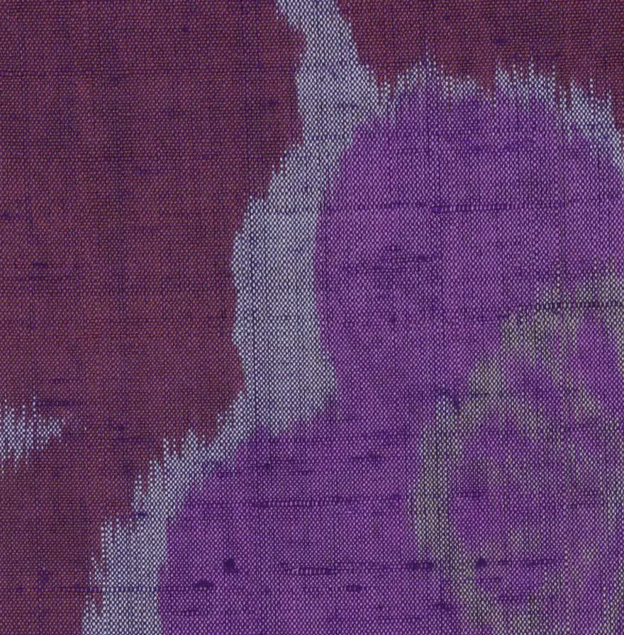 This vintage magenta meisen silk showcases striking ume blossoms in purple, complemented by leaves in a light shade of cool grey and outlining. The flower centers feature a medium shade of warm grey. The base silk, typical of meisens, is thinner than rinzu but offers a terrific drape. In excellent condition, it measures 14 inches by 61 inches (36 cm x 155 cm).