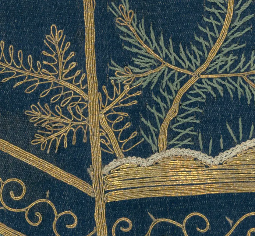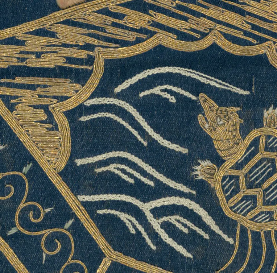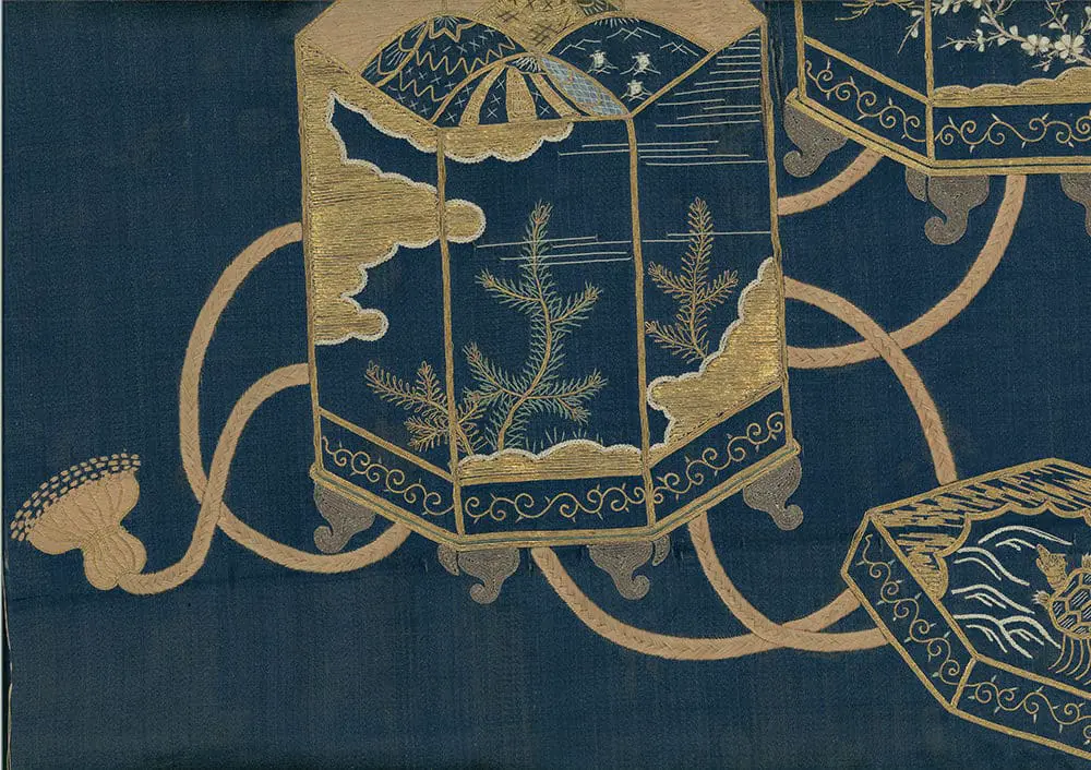 Despite its overall good condition, there are areas of concern noted: the fine blue silk background exhibits several areas of silk splitting and numerous small darkened patches. However, the intricate and sophisticated embroidery remains in very good condition, showcasing meticulous artistry and attention to detail.