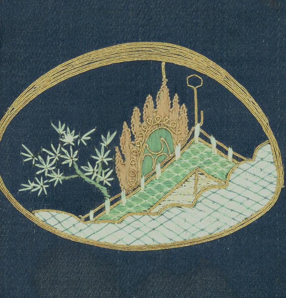 The embroidered depiction of the 'kaioke' containers, used in the refined game of 'kai-awase,' reflects cultural elegance and noble pursuits.