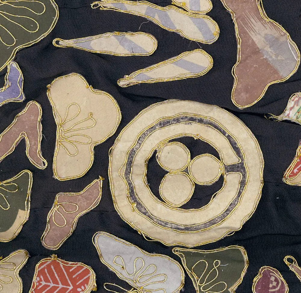 This uchikake costume for a Bunraku puppet measures 38 inches (96.5 cm) from sleeve-end to sleeve-end and stands 50 inches (127 cm) tall. It's constructed from appliqués mounted on sections of a late Meiji or early Taisho kimono, giving it an almost life-size appearance. The garment is in very good condition.