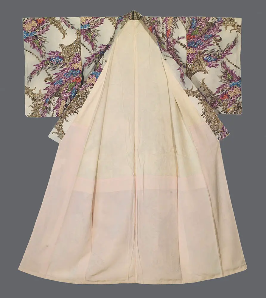 The substantial weight of the chirimen crepe and its lined construction speak to both practical considerations for cold weather wear.