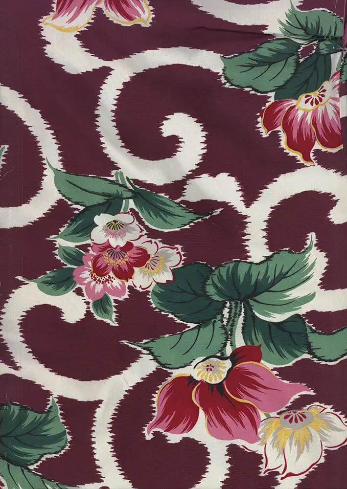 This silk kimono, with a cotton inner lining, showcases flowers on an arabesque pattern. It measures 49 inches (124 cm) from sleeve-end to sleeve-end and stands at a height of 56 inches (142 cm).