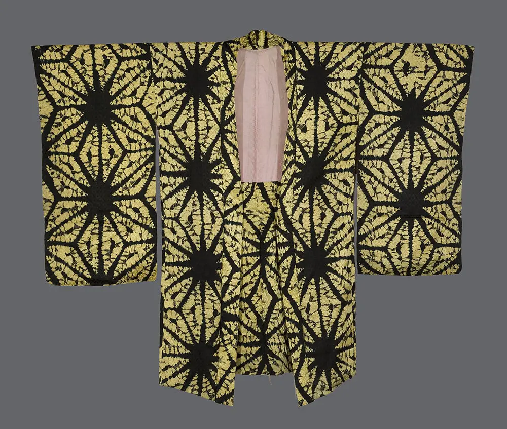 In this composition, a remarkable geometric pattern blends traditional Japanese aesthetics with elements reminiscent of Western art movements. The garment features a bold, repetitive design of asanoha (hemp leaf) motifs created using the shibori dyeing technique. This intricate pattern covers the entire surface of the haori in a mesmerizing display of black lines against a golden background. The precision of the lines and the sharpness of the contrast between the yellow and black suggest a masterful level of craftsmanship. The color palette of this haori is dominated by bold contrasts between black and golden yellow. The asanoha motifs are rendered in black, standing out dramatically against the vibrant background. This high contrast not only emphasizes the intricate design of the hemp leaf pattern but also brings a dynamic energy to the garment. The soft rinzu silk base fabric, with its self-pattern of faux-kanoko shibori, adds a luxurious quality, creating subtle light reflections and texture changes as the wearer moves.