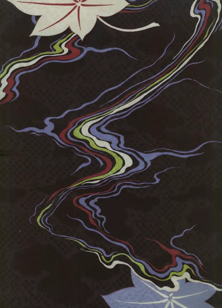 The use of nature motifs, particularly the maple leaves, is deeply rooted in Japanese artistic heritage, reminiscent of the decorative arts of the Edo period. However, the abstract, fluid lines that dominate the design show an influence of Art Nouveau, with its emphasis on organic, flowing forms. The abstract fluid lines, rendered in a spectrum of colors including blues, reds, and whites, hint at the psychedelic art of the 1960s and 70s. There is also a touch of Surrealism in the dreamlike quality of the floating maple leaves and the fluid, almost otherworldly streams.