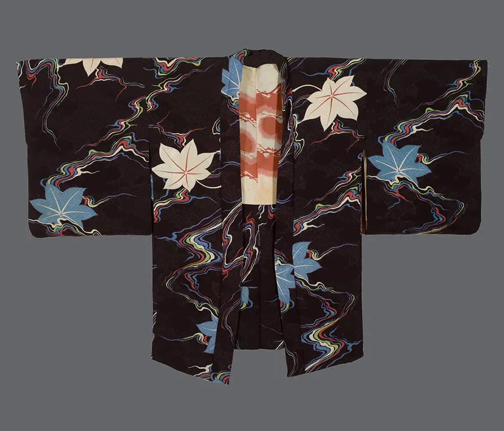 Crafted from luxurious rinzu fabric, this haori features large, stylized maple leaves rendered in soft blues and creams that stand out vividly against the rich, dark background. The interplay of these colors creates a striking contrast that draws the eye to the intricate details of the leaves. The flowing, undulating lines that weave through the composition suggest a dynamic sense of movement and fluidity. These lines, which include accents of white, blue, red, and yellow, resemble swirling water or wind, adding a natural, elemental quality to the piece.