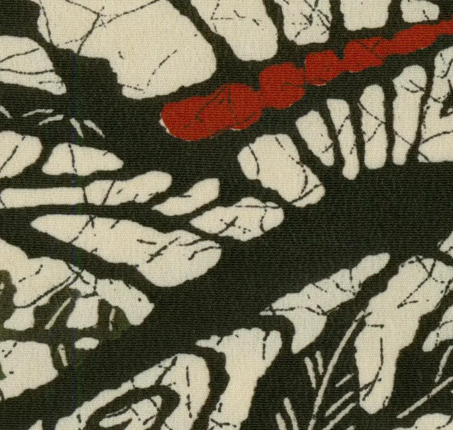 This silk woman's haori showcases abstract nature motifs in what seems to be a batik technique. It's in very good condition with only minor imperfections. Its measurements are 50 inches from sleeve-end to sleeve-end and 35 inches in height (127 x 89 cm).