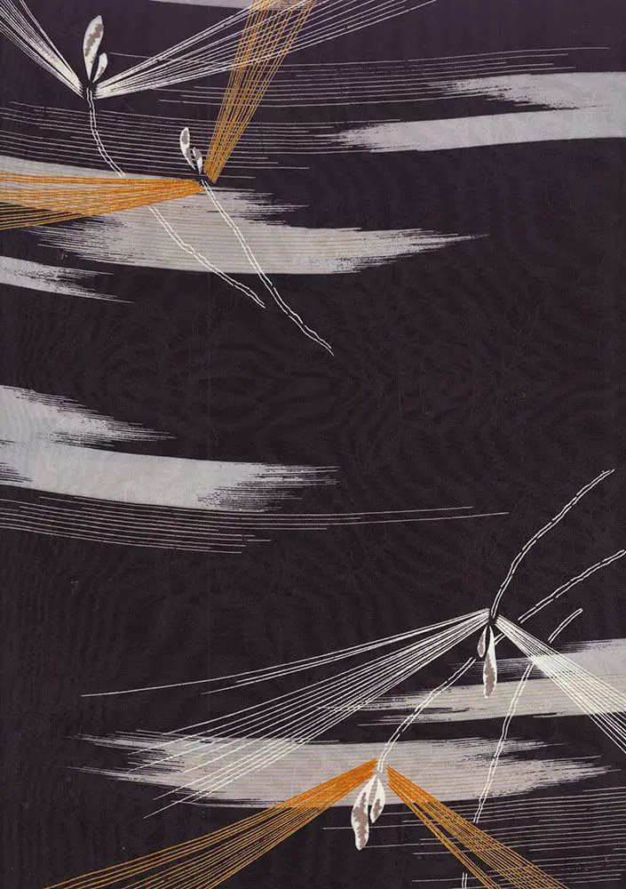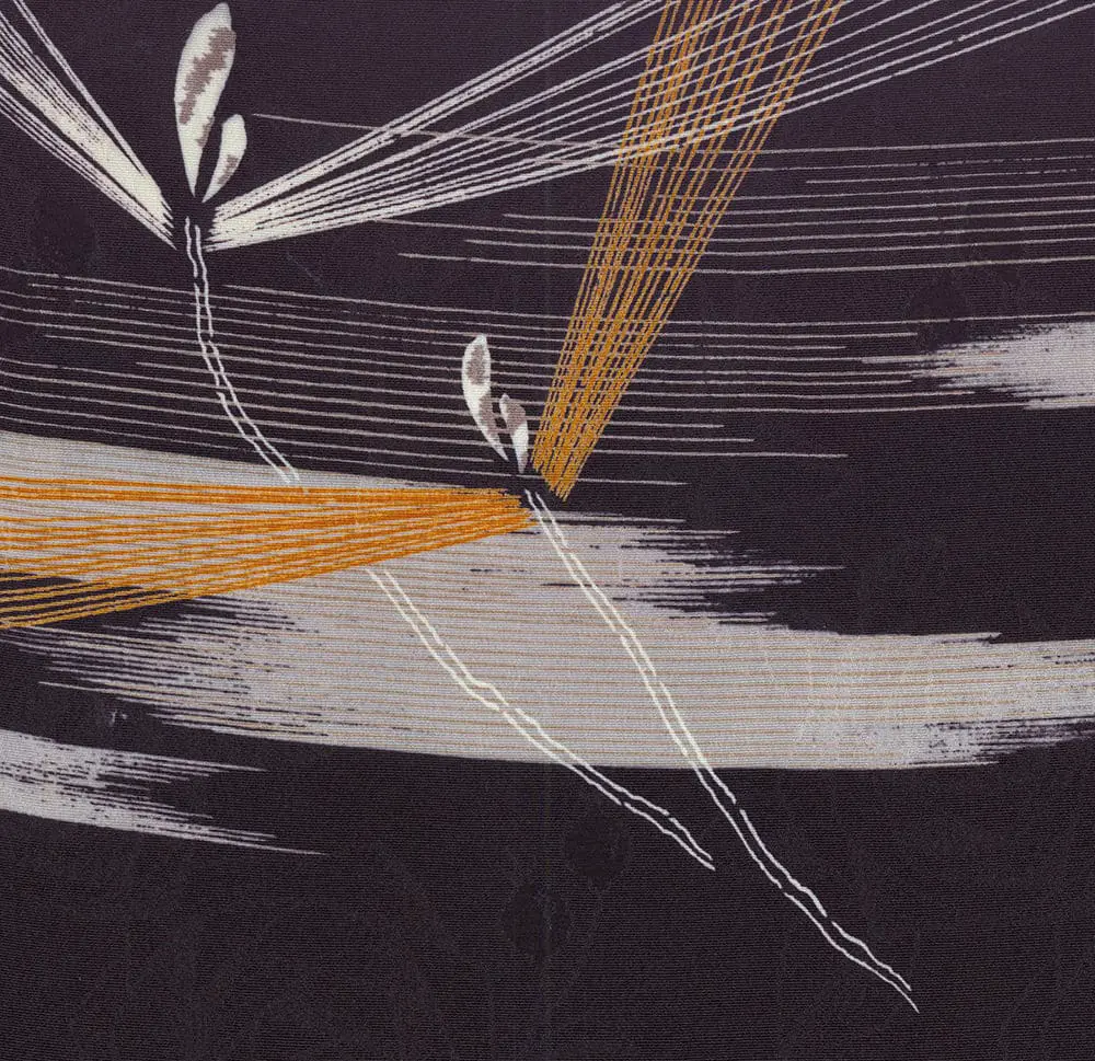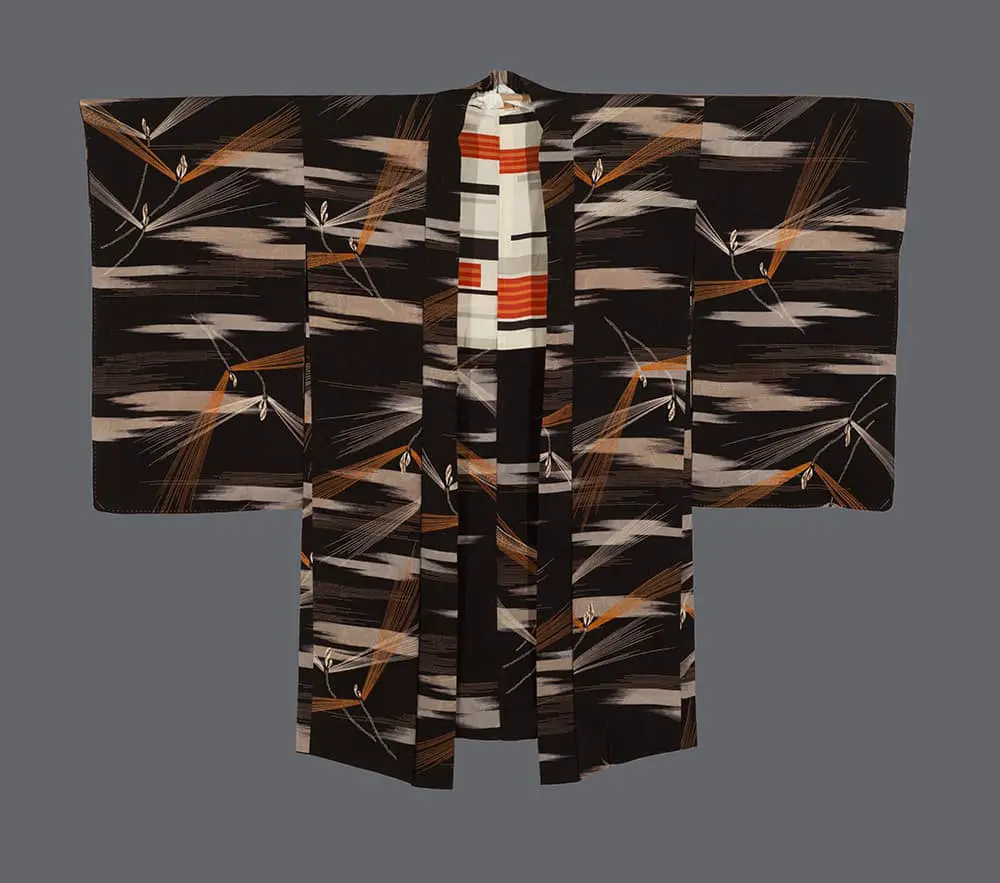This haori features dynamic, flying seed motifs, and possesses a sophisticated color palette of deep charcoal, silver-gray, warm amber, and cream creates a sense of dramatic contrast that emphasizes the angular, geometric quality of the composition.