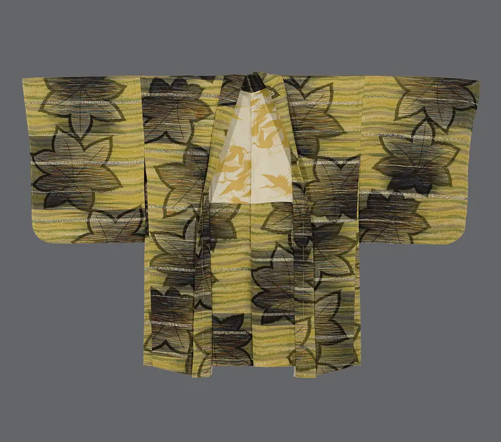 This woven silk haori has a relatively thick texture. It's in very good condition, with minor imperfections, measuring 52 inches (132 cm) from sleeve-end to sleeve-end and standing at a height of 32 inches (81 cm).