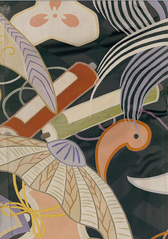 The design incorporates a variety of traditional Japanese auspicious motifs, arranged densely and dynamically, with elements overlapping and intertwining to create a sense of movement and visual richness. The black background provides a dramatic backdrop that allows the vibrant colors of the motifs to stand out. The intricate details and the careful placement of each element suggest a high level of craftsmanship and artistry.