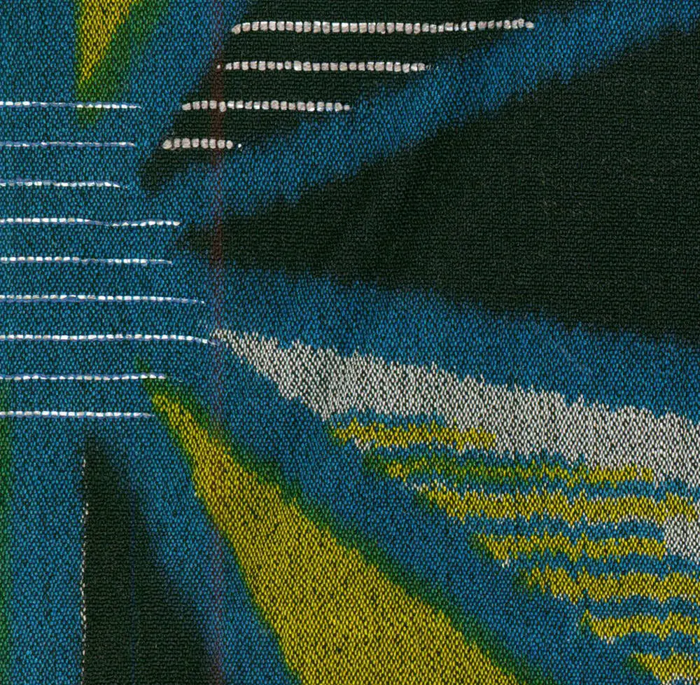 This meisen haori features a bold pattern of interlocking triangles that create a dynamic, almost three-dimensional effect. The color palette is sophisticated and contemporary, consisting primarily of chartreuse green, black, and silver, with accents of teal blue. The use of metallic silver highlights adds a luxurious shimmer to the piece and enhances the modern feel of the design, creating a play of light and texture across the surface of the fabric.