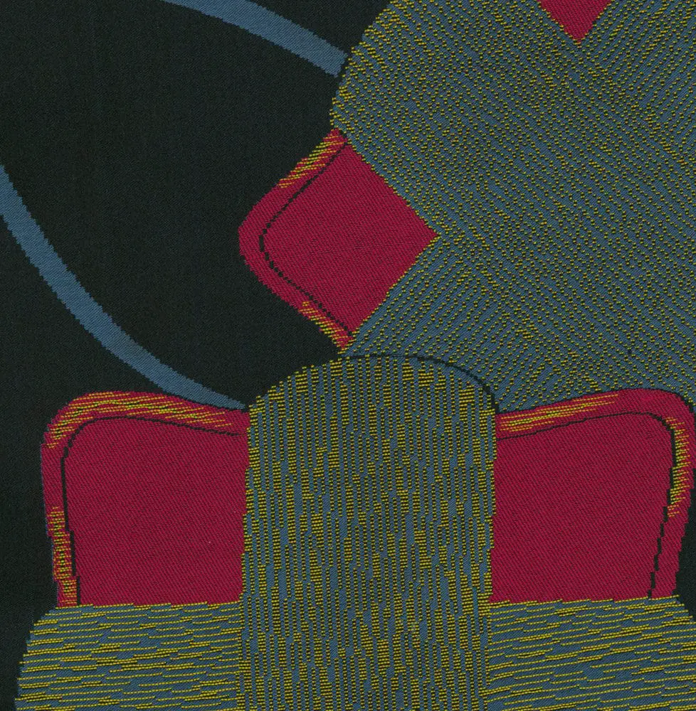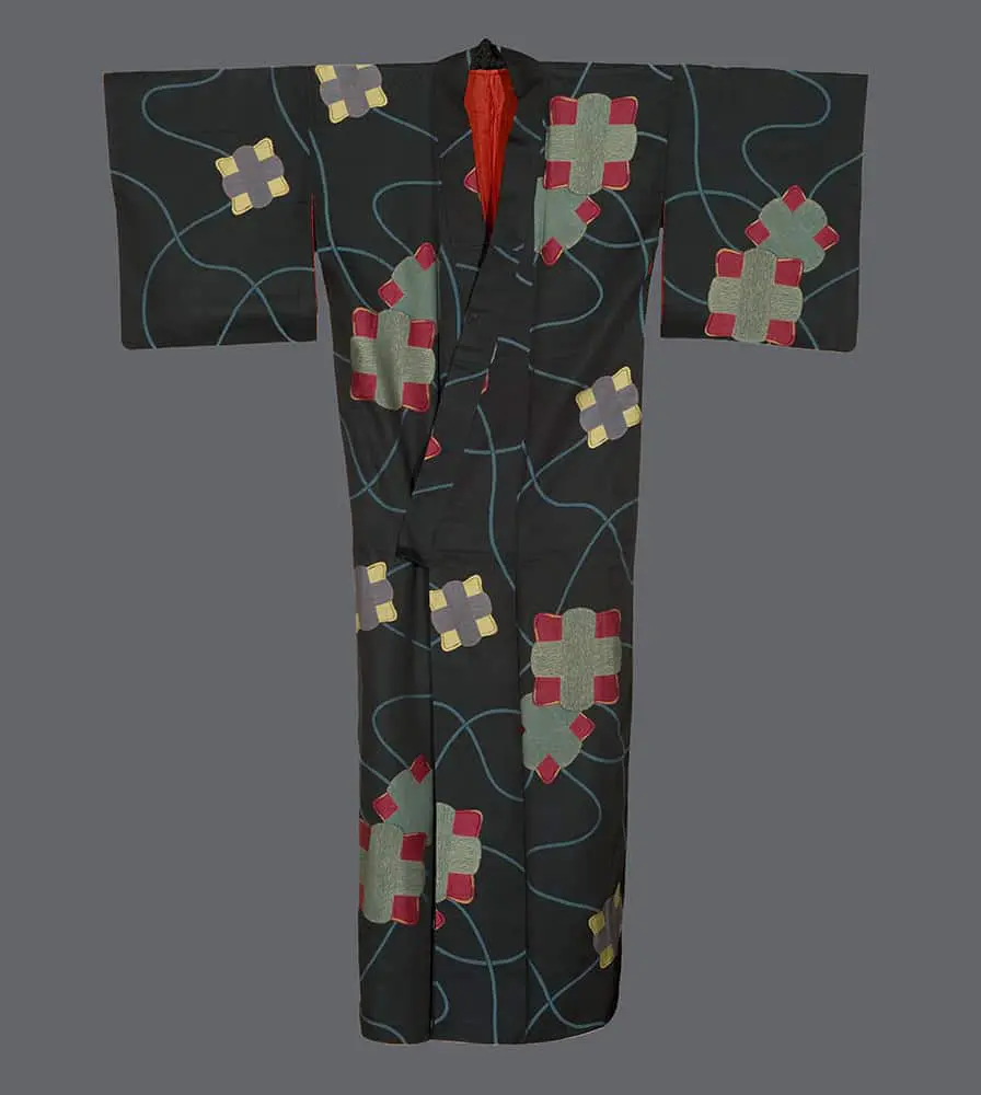 The Tanabata legend tells the story of two celestial lovers, Orihime the Weaver Princess (the star Vega) and Hikoboshi the Cowherd (the star Altair), who are separated by the Milky Way and allowed to meet only once a year. The bobbin or shuttle motif is a direct reference to Orihime's role as a divine weaver. Including this design on a kimono serves as a celebration of the festival and an allusion to feminine skill in weaving, diligence, and the romantic narrative of the celestial lovers. Artistically, the kimono's design is a blend of tradition and modernity. The geometric, almost abstract rendering of the bobbins in muted red, green, and gold tones, combined with the flowing, asymmetrical teal lines that may suggest the threads or the celestial river, feels contemporary for the 1940s. The overall composition, with its dynamic yet uncluttered layout, reflects a modern design sensibility that values both symbolic depth and graphic clarity.