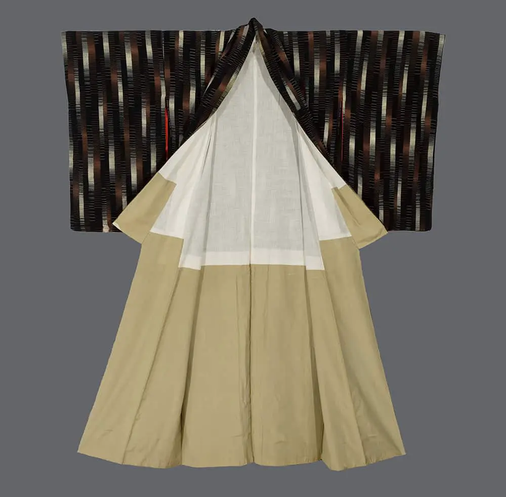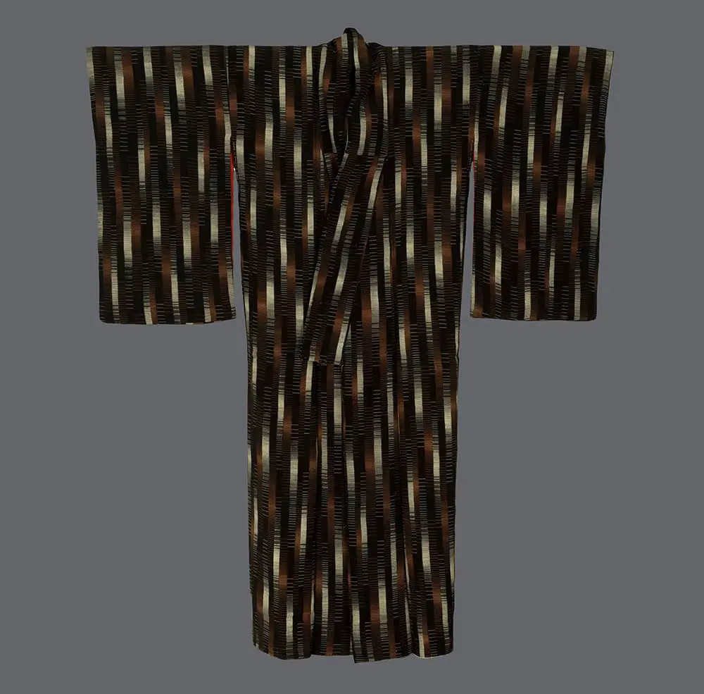 This chirimen silk kimono embraces a bold geometric abstraction that aligns closely with the modernist movements sweeping through international art and design during the interwar period. The garment features a sophisticated pattern of vertical dashes in cream, rust orange, and metallic accents scattered across a deep charcoal ground, creating a dynamic visual rhythm that suggests both industrial precision and organic spontaneity. The design demonstrates clear influence from contemporary abstract art movements, particularly the geometric reductionism of early modernism, while the seemingly random yet carefully orchestrated placement of the linear elements recalls the controlled spontaneity found in avant-garde compositions of the era.
