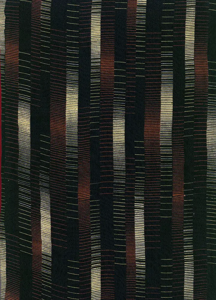 The vertical dash motif, while appearing deceptively simple, carries profound aesthetic significance within the context of Japanese design philosophy. These linear elements can be read as an abstracted interpretation of falling rain (ame), bamboo segments, or even calligraphic brush strokes, connecting the modernist vocabulary to deeply rooted cultural references. The varying colors and metallic highlights create a sense of temporal movement across the textile's surface, as if capturing light reflecting off water or the play of shadows through a bamboo grove, thus maintaining the Japanese aesthetic principle of finding beauty in natural phenomena even within this highly abstracted framework.