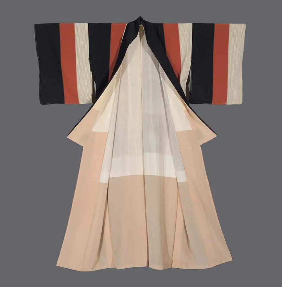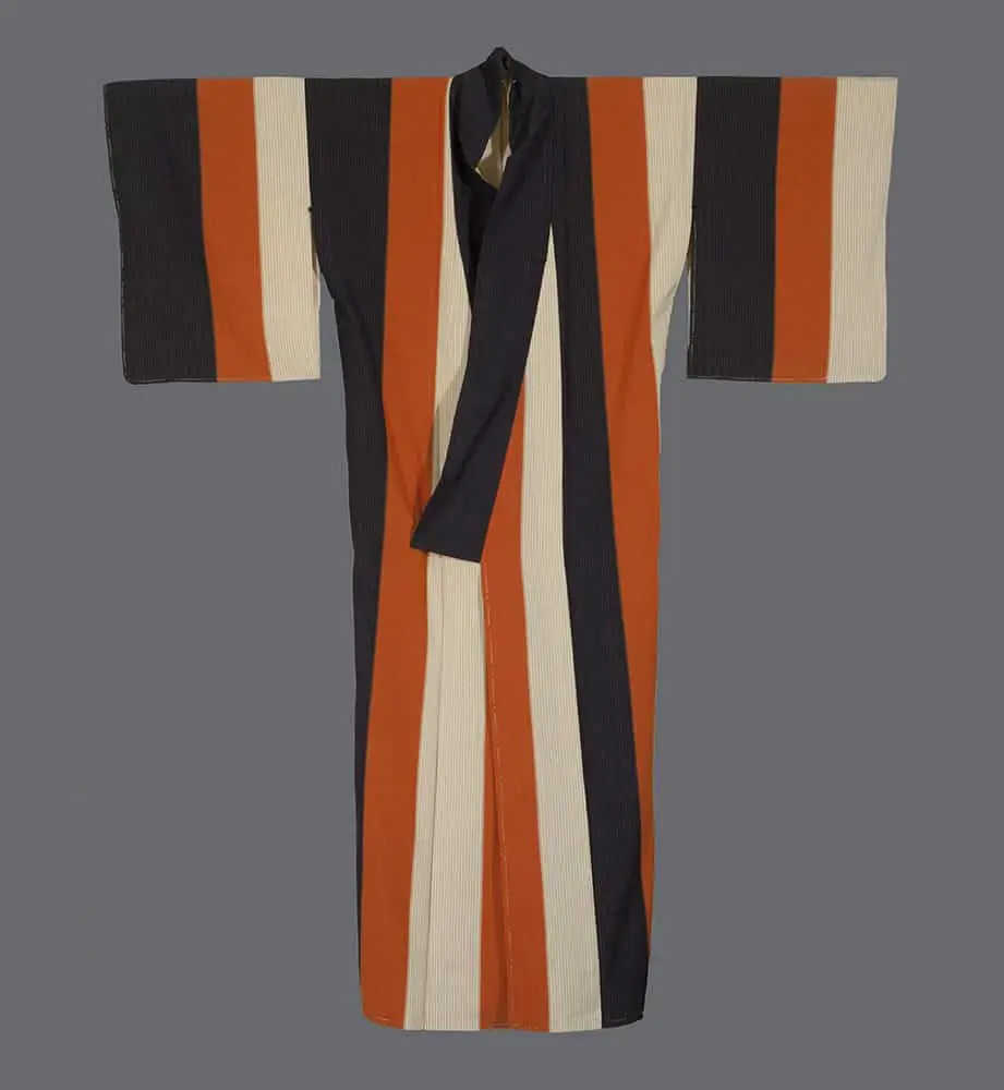 The design reflects the influence of international modernist movements, particularly the Bauhaus emphasis on primary geometric forms and industrial aesthetics, while simultaneously drawing from Japan's own tradition of striped patterns or "shima." The vertical orientation maintains the classical Japanese preference for patterns that emphasize the body's natural lines and movement. The bold scale of the stripes represents a departure from the more delicate proportions typically found in earlier Japanese textiles, suggesting the period's growing confidence in embracing dramatic visual statements. The color palette evokes both traditional Japanese earth tones and the vibrant hues favored in 1960s-70s international fashion, positioning this garment at the intersection of cultural preservation and contemporary innovation.