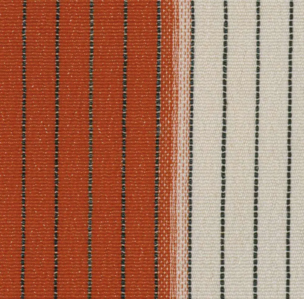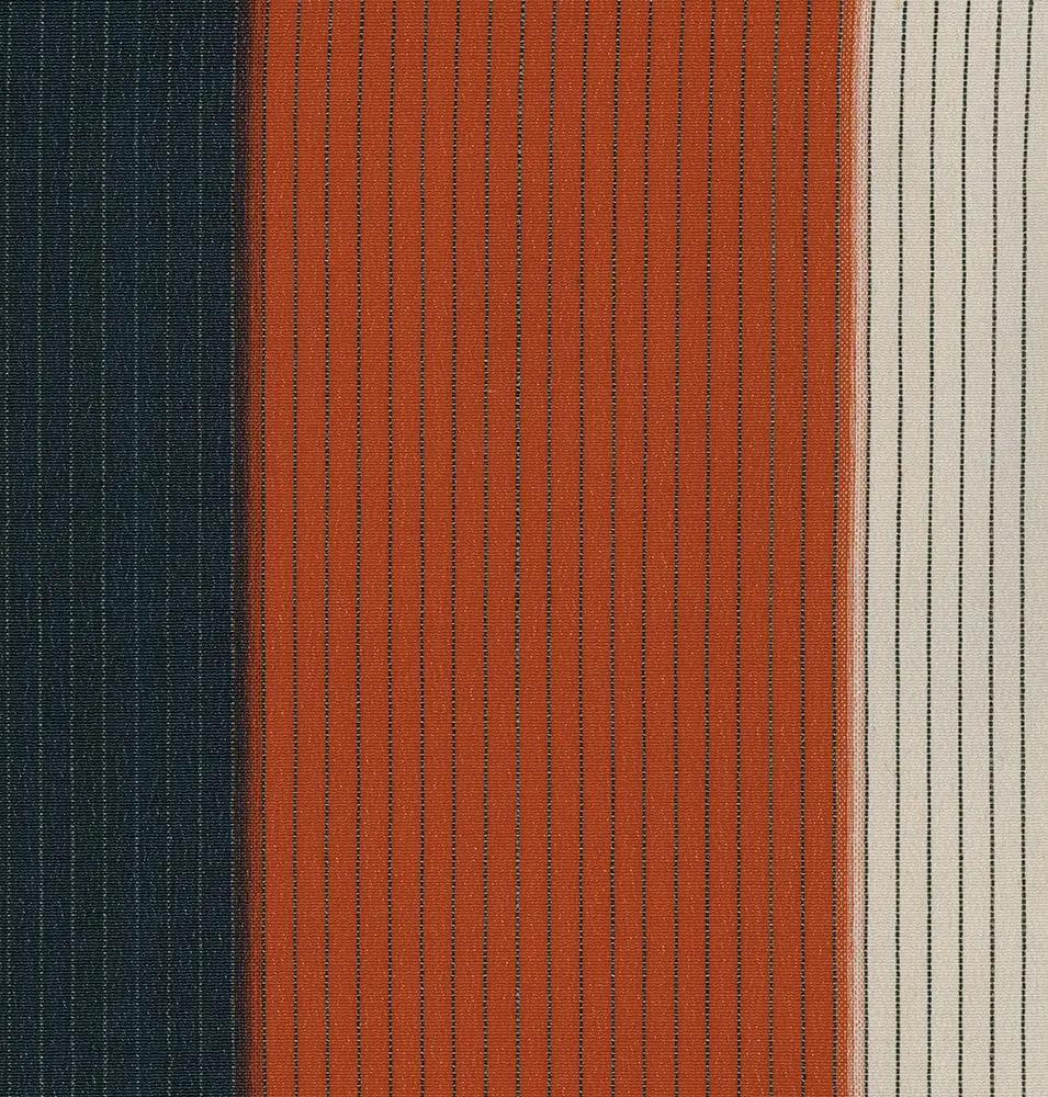 The composition features broad vertical stripes in a striking palette of rust orange, deep navy, and cream, woven with meticulous precision that creates clean, geometric divisions across the garment's surface. The weaving technique produces subtle textural variations within each stripe, with fine horizontal elements adding dimensional quality to what could otherwise be a flat geometric pattern.