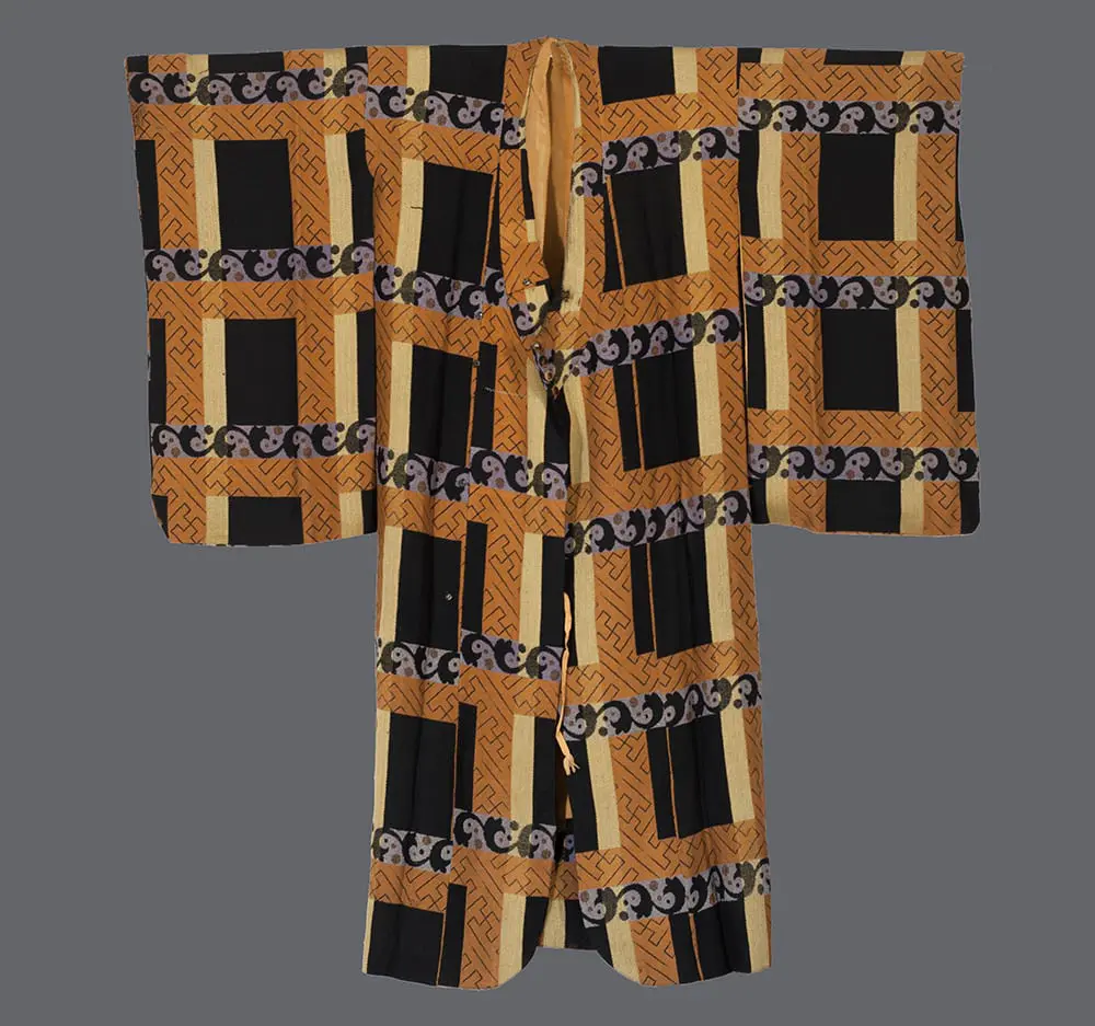 This michiyuki displays a sophisticated lattice framework in rich golden-orange tones, creating a geometric grid that contains alternating motifs of solid black rectangles and delicate scrolling wave patterns rendered in gray and white. This systematic arrangement reflects the influence of Art Deco sensibilities that were permeating Japanese design during this era, while maintaining the structural elegance characteristic of traditional Japanese pattern-making.
