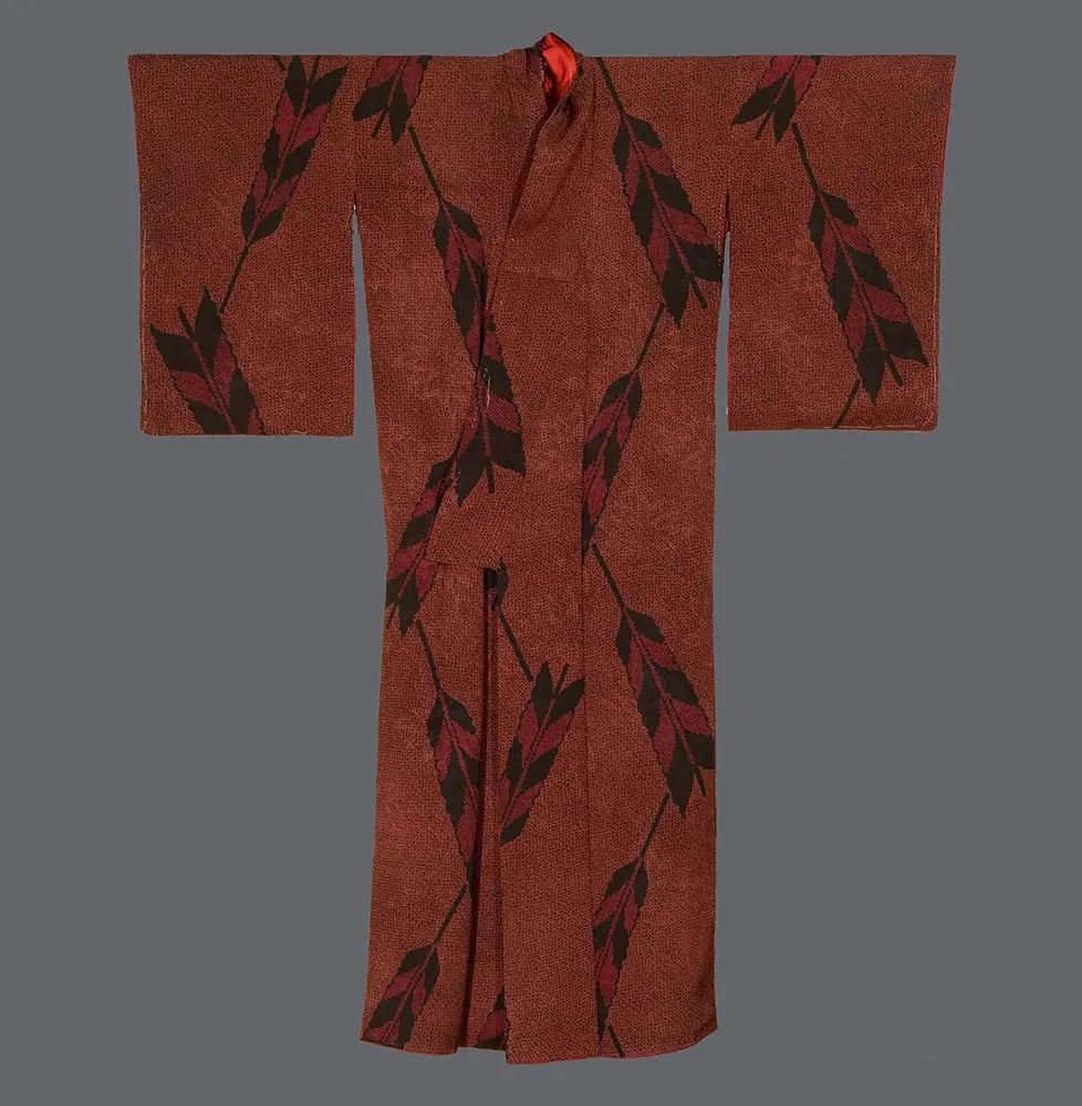 This understated yet sophisticated kimono features a subtle all-over pattern of yabane (arrow feather) motifs rendered in dark brown and burgundy against a warm rust-colored ground, creating a sophisticated monochromatic palette that reflects the period's movement toward more restrained, modern sensibilities. The diagonal arrangement of the arrow feathers creates a gentle visual rhythm across the surface, evoking the classical Japanese design principle of asymmetrical balance while maintaining the geometric precision characteristic of Art Deco influences that were permeating Japanese decorative arts during the 1920s and 1930s.