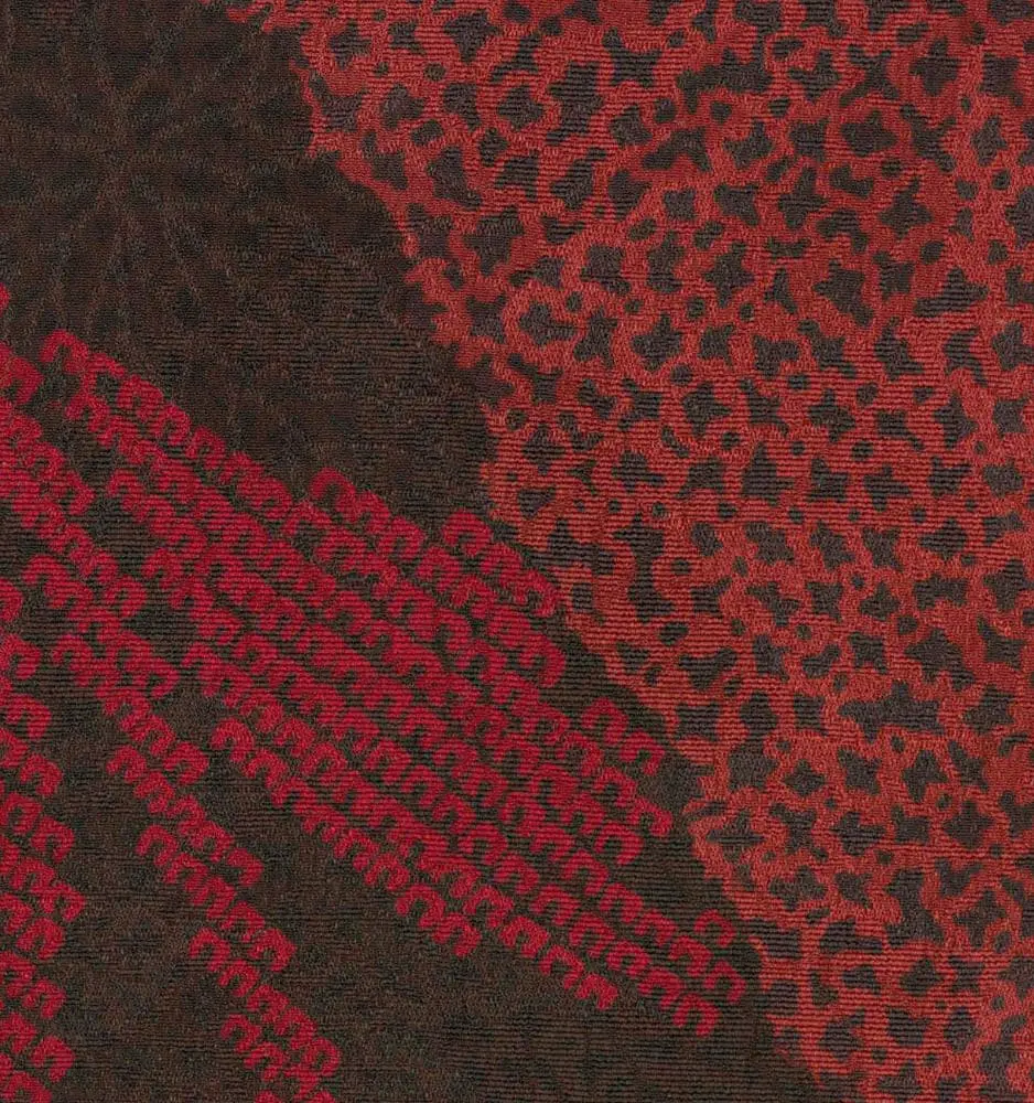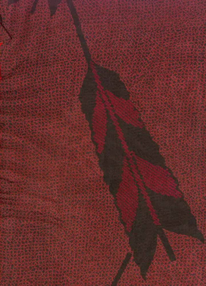 The technical execution reveals the era's innovative approach to traditional motifs through the use of faux-shibori printing techniques, which allowed for the mechanical reproduction of tie-dye effects that would have been time-consuming and expensive to achieve through authentic hand-tied methods. The arrow feather pattern shows subtle gradations and organic variations that successfully mimic the irregular, flowing qualities of true shibori, demonstrating the sophisticated printing technologies that emerged during this period of rapid industrialization.