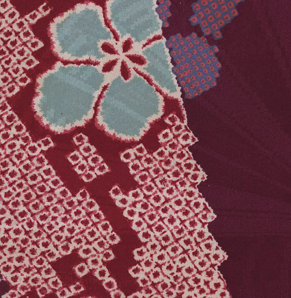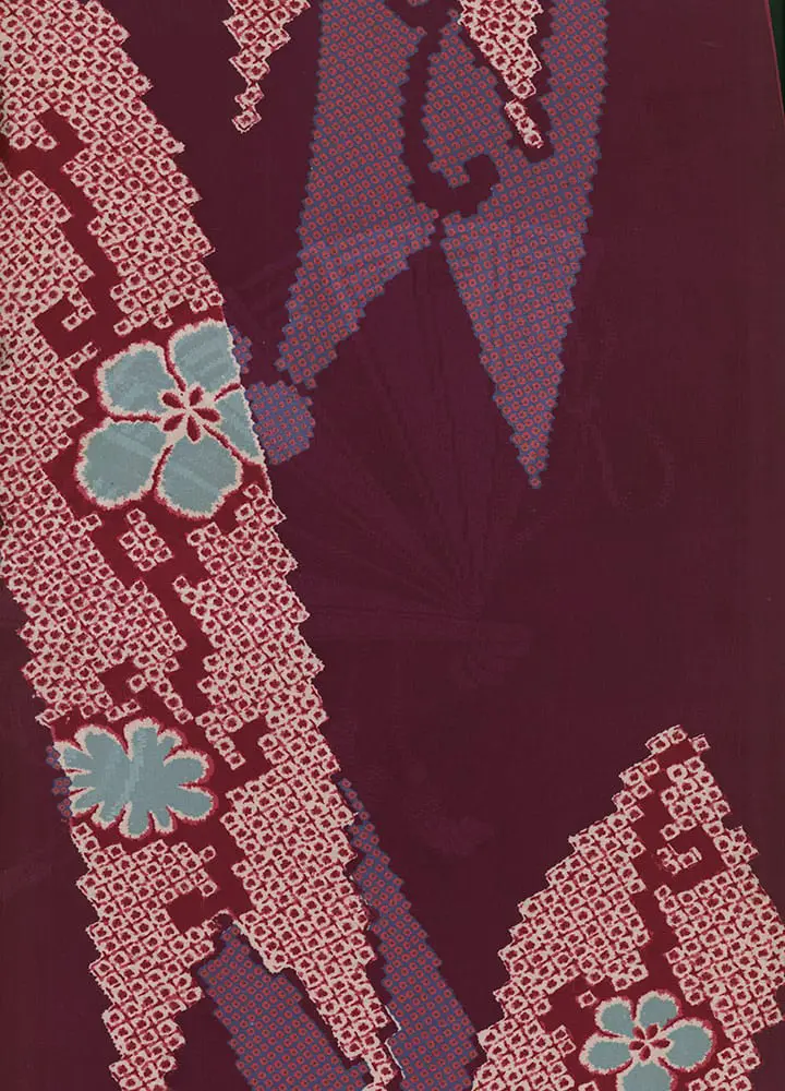 The technical execution reveals remarkable craftsmanship in its layered approach to surface decoration, combining authentic shibori tie-dye techniques with faux-shibori printing methods to create textural variety and visual depth. The true shibori elements, evident in the red and white arrow feathers, display the characteristic organic irregularity and subtle gradations that can only be achieved through hand-tied resist dyeing, while the faux-shibori pink and blue feathers demonstrate the period's embrace of mechanical reproduction techniques that could mimic traditional effects at scale. This juxtaposition reflects the broader cultural dialogue between handcraft traditions and industrial innovation that characterized Japanese textile production during this transformative period.