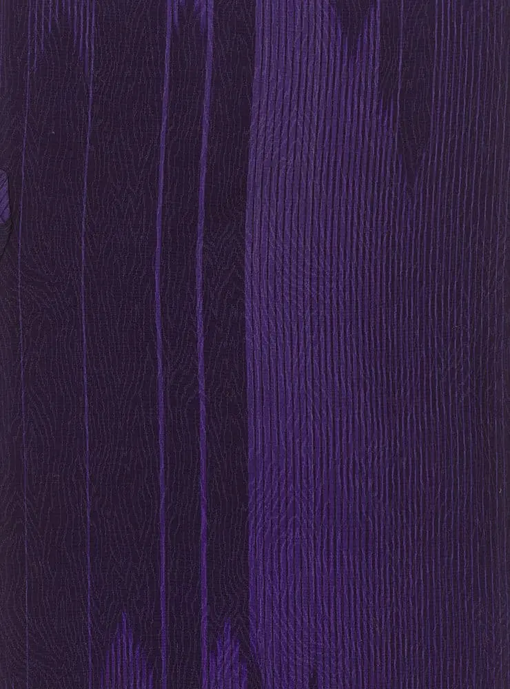 The yabane pattern holds significant symbolic meaning in Japanese culture, traditionally associated with protection from evil and the ability to ward off misfortune. Arrows that have hit their target cannot return, making this motif particularly auspicious for celebrations and new beginnings. The pattern was especially popular for New Year's festivities and coming-of-age ceremonies, as it symbolized the hope that troubles would not return to the wearer. The choice to execute this traditional motif in a sophisticated monochromatic palette of purples - ranging from deep eggplant to rich violet - reflects the modernist tendency toward tonal subtlety and refined color harmonies that gained prominence in mid-century Japanese design.