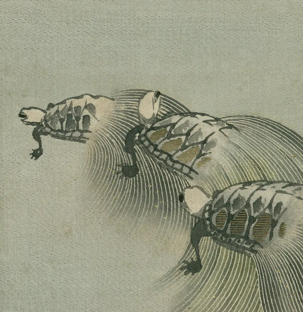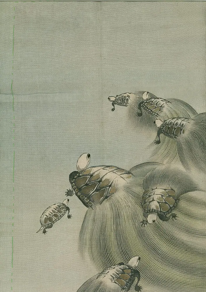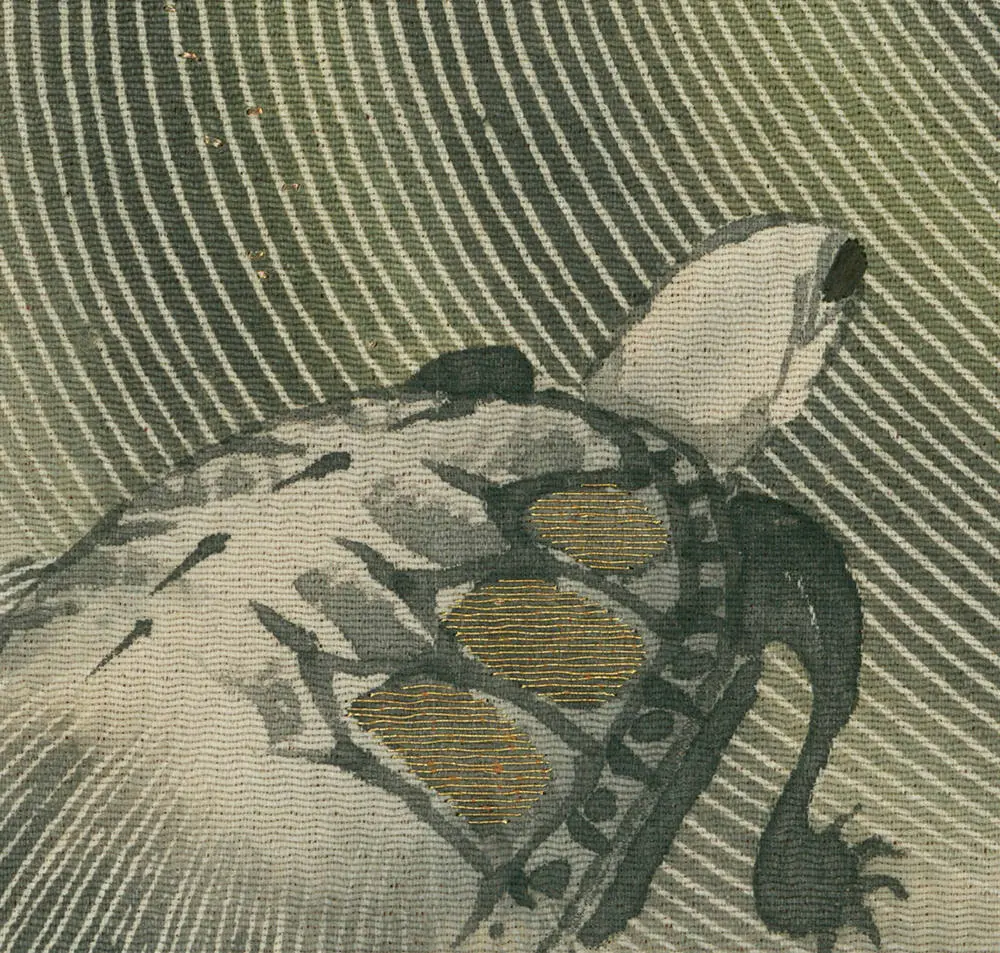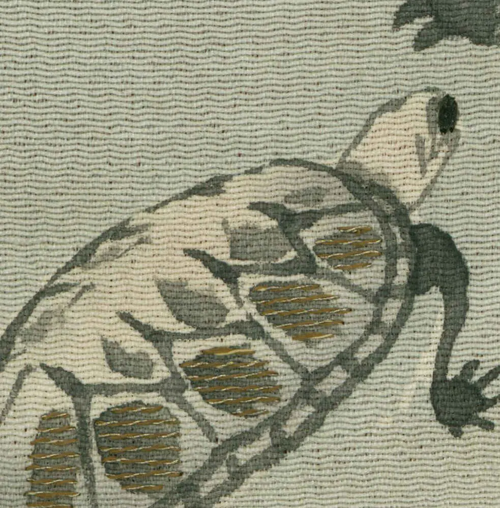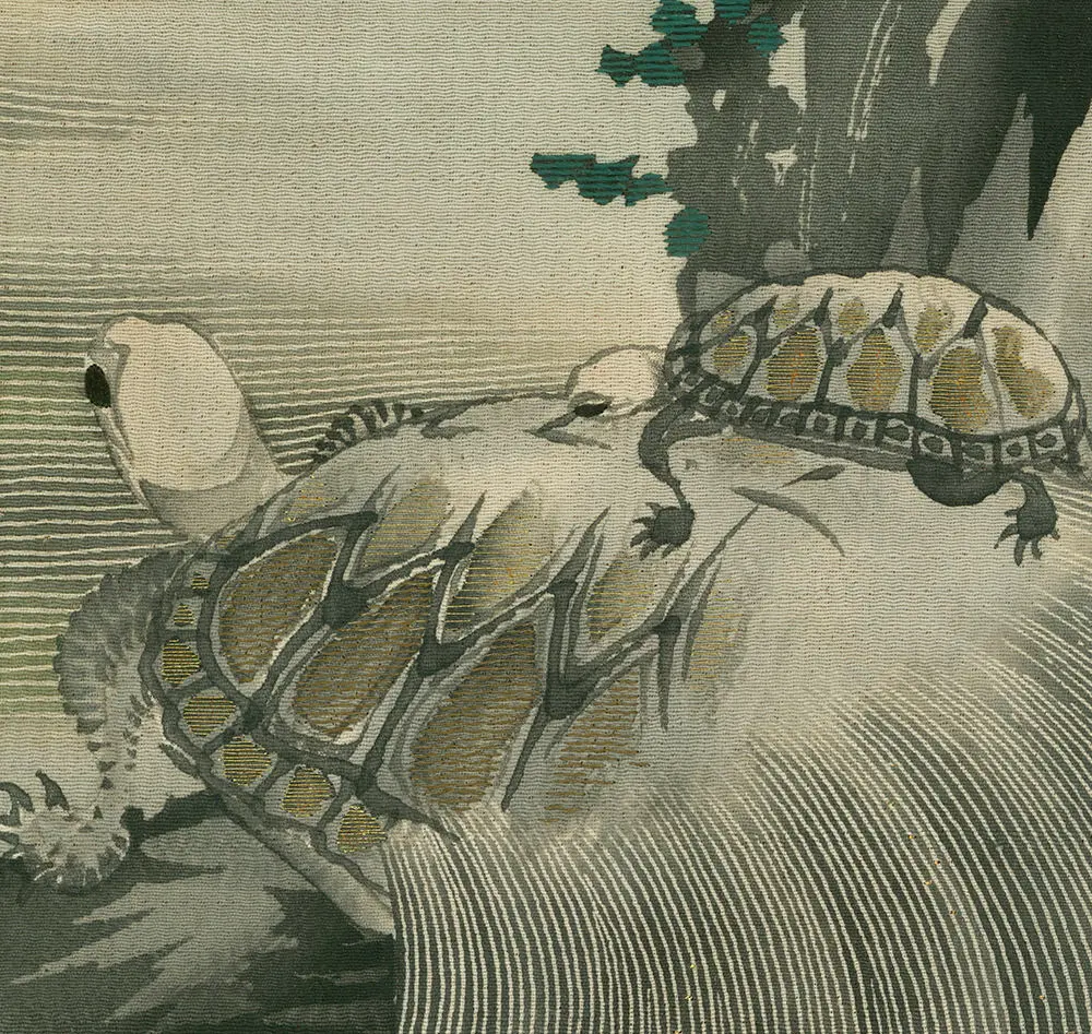 This chirimen silk fukusa portrays a remarkable scene featuring fifteen minogame turtles, some ascending skyward, adorned with yuzen-dyeing and highlighted by gold metallic thread embroidery. Measuring 25 inches by 28 inches (64 cm x 71 cm), it's in very good condition. The minogame, a legendary creature part turtle and part dragon, symbolizes longevity and good fortune with a life span of 10,000 years. Its name translates to 'raincoat turtle' due to the seaweed or vegetation that grows on its back, resembling a peasant's straw raincoat as it ages. While minogame are common subjects in Japanese art, the imagery presented here, depicting them ascending skyward, is both distinctive and excellently executed, making this fukusa stand out for its concept and artistry.