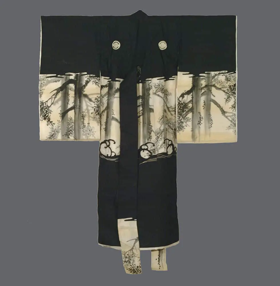 The symbolic resonance of this design carries profound meaning for a ceremonial blessing garment. The hawk, revered in Japanese culture as a symbol of keen vision, swift action, and noble bearing, represents the aspiration that the child will possess clarity of purpose and the courage to act decisively in life's pursuits. The dramatic contrast between the deep black ground and the luminous central composition, enhanced by the strategic use of metallic threads, creates an almost theatrical effect that recalls both the bold compositions of ukiyo-e masters and the emerging modern sensibility that would characterize early 20th-century Japanese art. This kimono thus serves as both a stunning example of Meiji-period textile artistry and a complex symbolic statement about the balance between strength and refinement that was considered essential to noble character.