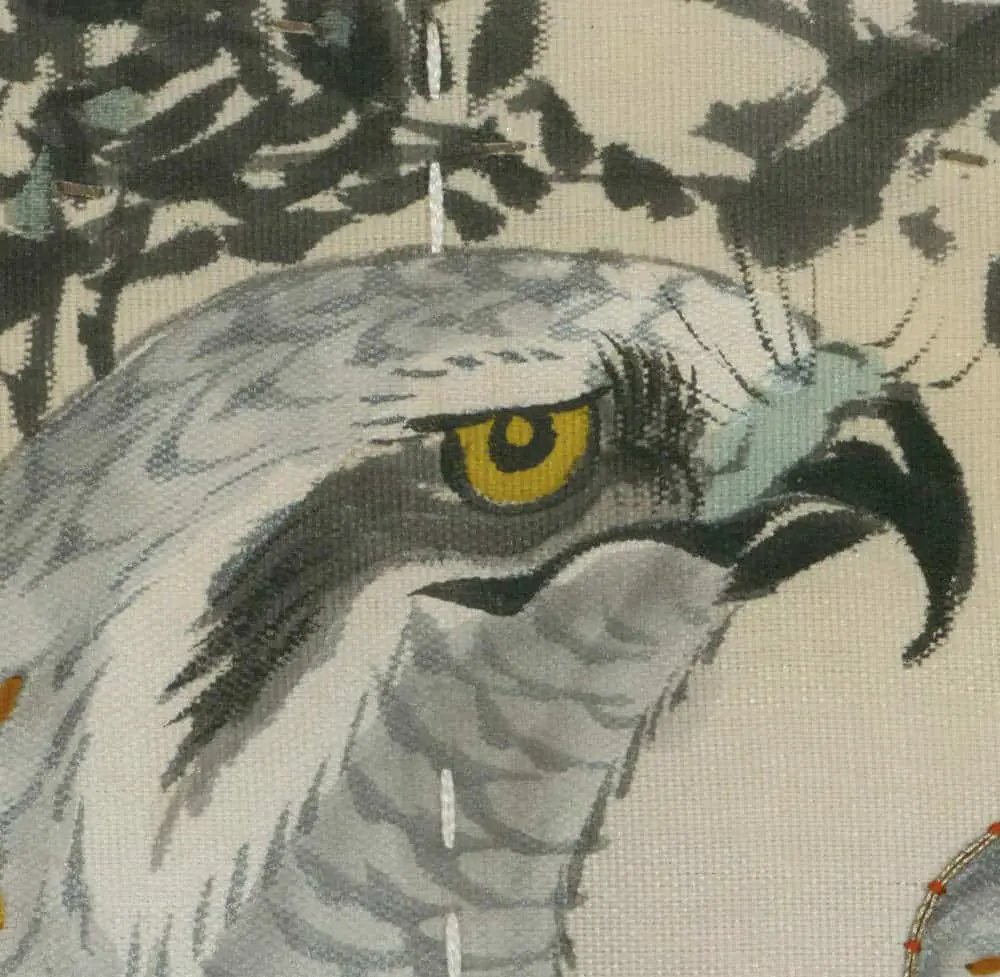 The artistic execution reveals the hand of a master craftsman who understood the subtle interplay between different painting techniques on silk. The hawk itself is rendered with meticulous attention to anatomical accuracy—each feather carefully delineated through a combination of fine brushwork and embroidered highlights that catch light and create textural depth. The bird's piercing yellow eye and sharp beak convey an intensity that speaks to the creature's predatory nature, while the flowing treatment of its plumage demonstrates the artist's command of both controlled yuzen techniques and the more spontaneous sumi-e tradition. The surrounding branches, painted with the characteristic loose brushwork of classical Japanese flower painting, provides a lyrical counterpoint to the hawk's fierce presence, creating a visual dialogue between power and grace that reflects the aesthetic sensibilities of the Rinpa school and the naturalistic observations increasingly valued during the Meiji period.