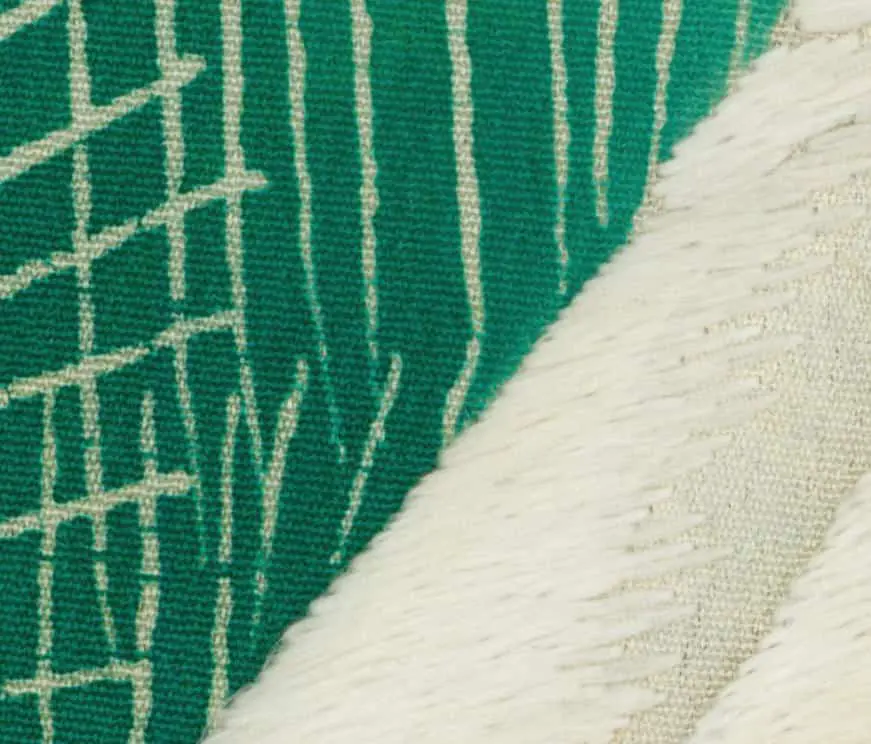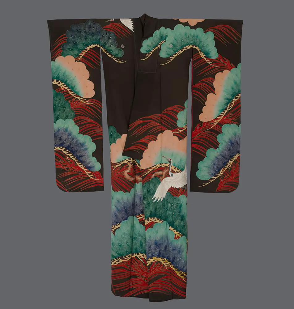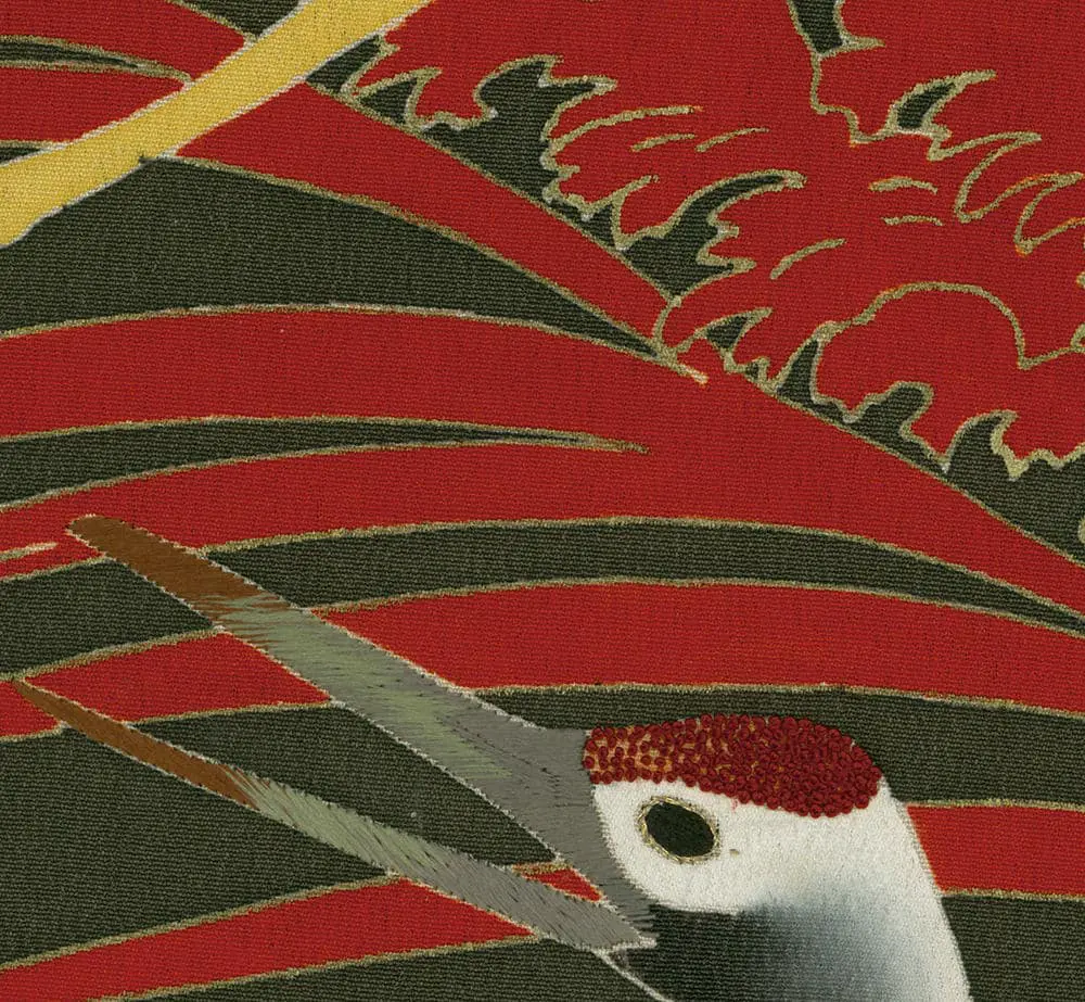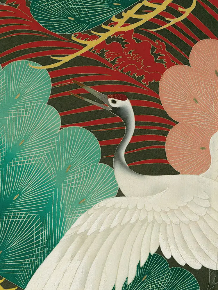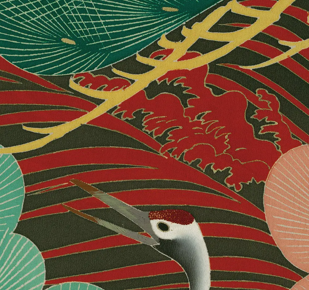 The embroidery work represents exceptional craftsmanship. Sagara embroidery - tiny raised knots - texture the crane heads, while metallic threads enhance the tail feathers with reflective brilliance. Delicate silk embroidery adds fine details to both crane and pine elements, strategically placed to create subtle light play and emphasize the garment's movement. This layering of techniques - yuzen painting, gold foil application, and multiple embroidery styles - creates remarkable textural and visual richness.