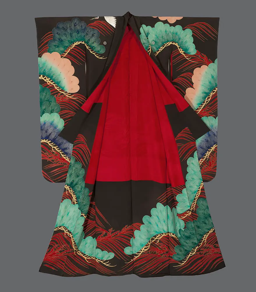 This magnificent kurofurisode combines multiple sophisticated techniques to create a garment of extraordinary visual impact and symbolic meaning. The dramatic black silk ground serves as a canvas for an auspicious composition of pine, cranes, and stylized waves - all traditional symbols of longevity, fidelity, and good fortune appropriate for wedding attire.