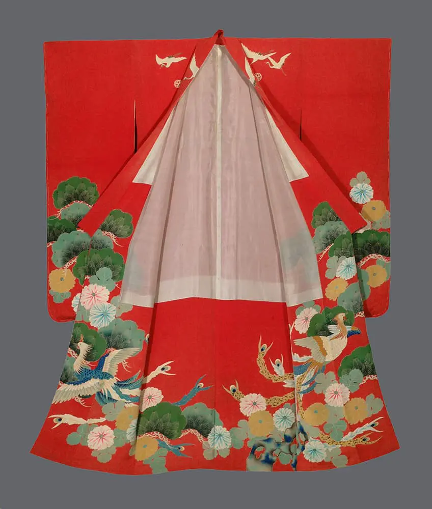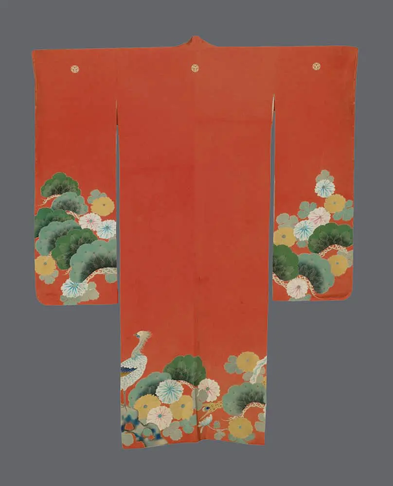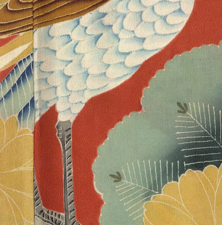 The artistic treatment reflects the sophisticated color sensibilities of the early 20th century, when textile artists began experimenting with more daring color combinations while maintaining classical motif vocabularies. The phoenix, pine, and flower combination represents an elevated symbolic program, as phoenixes embody imperial virtue, supernatural blessing, and good fortune - making them particularly appropriate for a young woman's formal kimono of high status. The evergreen pines represent steadfastness and eternal youth, while the seasonal flowers add delicate beauty to the composition. The technical excellence of the yuzen work is evident in the intricate scaled feather patterns of the phoenixes, the subtle gradations within each motif, and the crisp boundaries between colors, while freehand painted details add spontaneous touches that bring life to these mythical creatures. This unusual orange ground color choice demonstrates the period's embrace of more adventurous aesthetics while maintaining the essential elegance and supernatural grandeur expected in the finest formal women's wear.