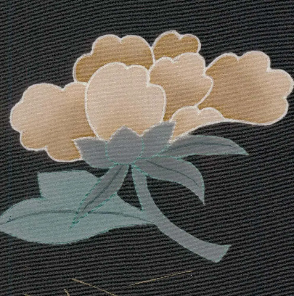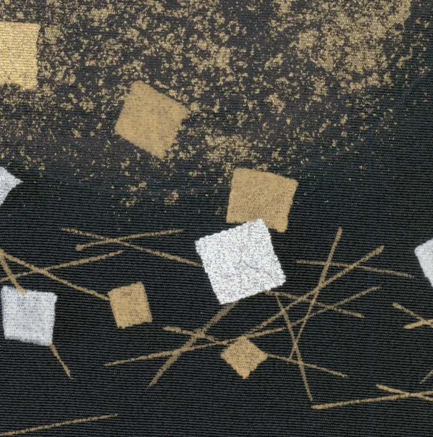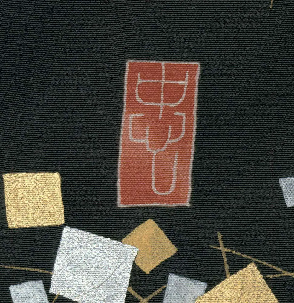The artistic style evokes elements of Nihonga, a modern Japanese painting movement that bridges traditional Japanese aesthetics with contemporary sensibilities, seen in the use of layered patterns, harmonious colors, and careful gold highlights. The flowing lines and balanced composition may also draw subtle inspiration from Art Deco motifs, prevalent in mid-20th-century Japanese design, though the core is unmistakably Japanese in its symbolic intent and technique. The presence of the rare 'seal' mark, "Rakuseikanshiki," notably used as an artist's signature or a prestigious workshop emblem, attests to the piece’s authenticity and highlights its value as a work of textile art.