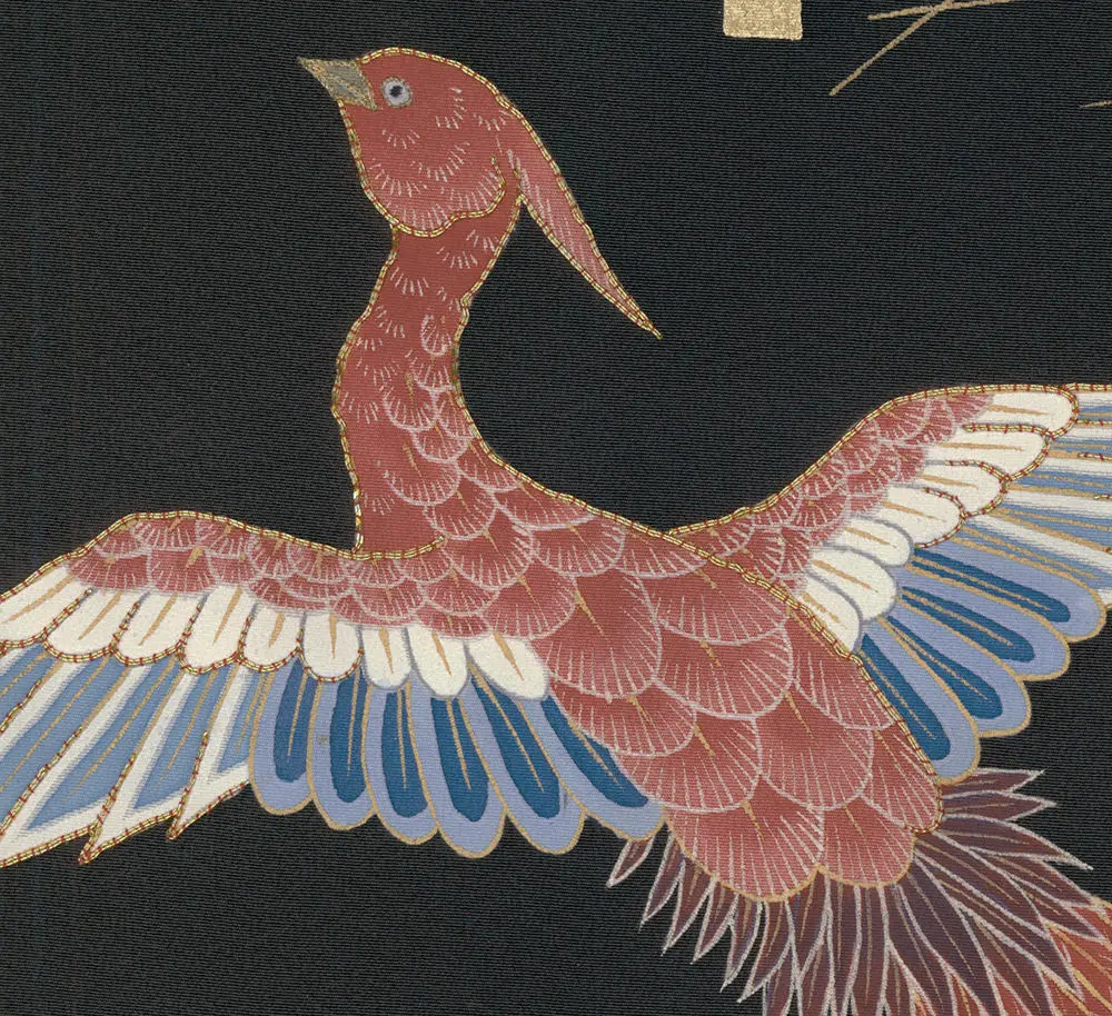 This furisode showcases meticulously yuzen-painted phoenix motifs, rendered with vibrant yet subtle colors and further illuminated by metallic couching that traces and emphasizes select contours. The depicted phoenix—a mythological bird associated with rebirth, immortality, and auspicious fortune—exudes elegance and dynamism, often surrounded by cloud-like forms and scattered floral elements. These motifs together symbolize renewal, prosperity, and harmony, drawing on cultural beliefs deeply rooted in East Asian lore.