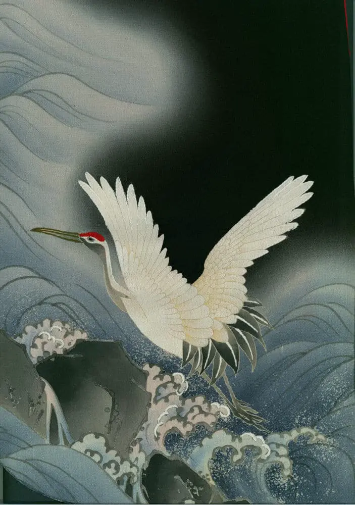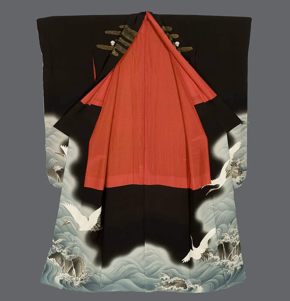 This wedding kimono represents the synthesis of traditional Japanese artistic values with the refined luxury expected of formal bridal wear during the early 20th century. The crane motif, symbolizing longevity, fidelity, and good fortune, makes it particularly appropriate for matrimonial occasions, while the restrained color palette and elegant spacing reflect the aesthetic principles of ma (meaningful emptiness) and wabi-sabi that are fundamental to Japanese design philosophy.