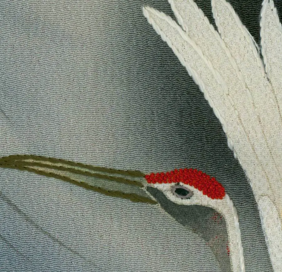 The artistic approach strongly evokes traditional Japanese painting aesthetics, particularly the influence of the Kano school and classical sumi-e ink painting traditions, where negative space plays as crucial a role as the painted elements themselves. The sparse placement of the cranes against the vast black expanse creates a sense of movement and infinity that recalls the compositional principles found in hanging scroll paintings and screen works. The detail work visible in the close-ups reveal the extraordinary technical skill involved, with the crane's distinctive red crown cap rendered in precise embroidery stitches while the subtle gradations in the bird's plumage demonstrate the sophisticated bokashi dyeing technique that creates naturalistic modeling and depth.