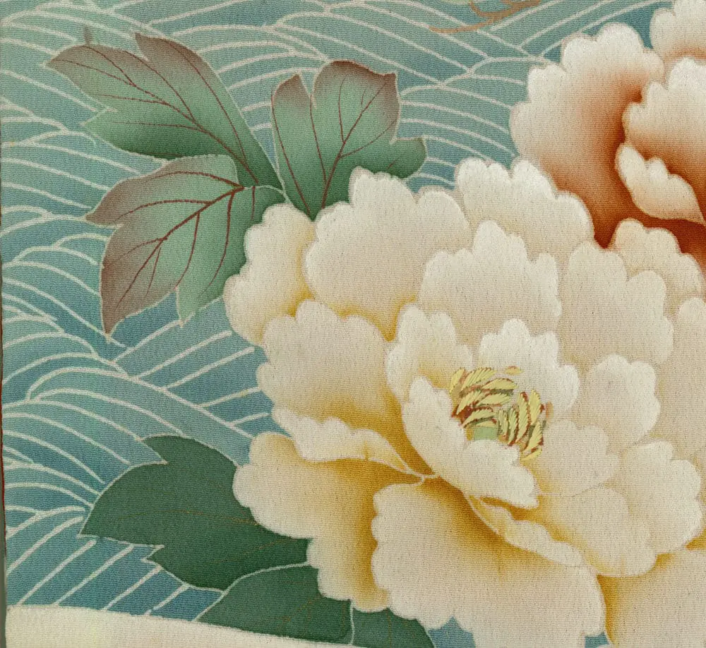 The combination of yuzen dyeing with embroidered highlights work in harmony to create depth, texture, and luminosity. This technique allowed artisans to achieve both the fluid, painterly qualities of yuzen and the dimensional richness that only embroidery can provide.