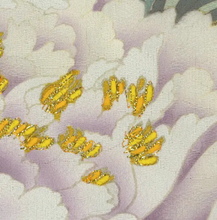The rinzu silk base with its woven damask peony motifs adds another layer of textural sophistication, creating subtle variations in light reflection that enhance the overall visual richness. This multi-layered approach to textile design - combining woven, painted, and embroidered elements - represents the pinnacle of Japanese textile artistry and demonstrates why Yamamoto's work transcended fashion to become wearable art.