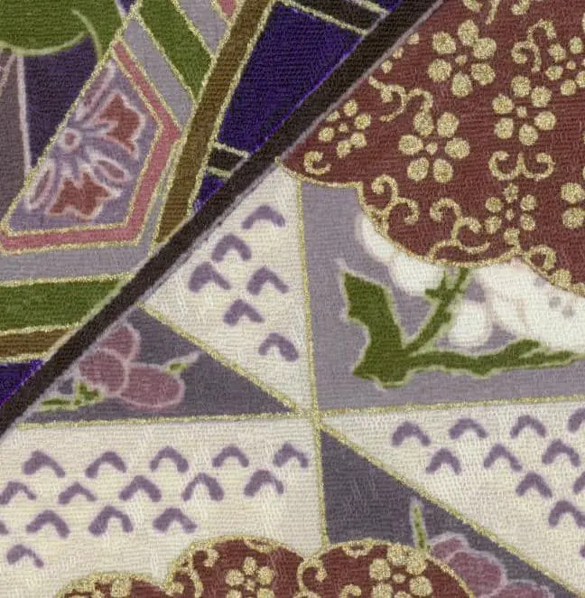The color palette - dominated by deep purples, soft lavenders, and sage greens with strategic gold accents - creates a sophisticated tonal harmony that feels both timeless and contemporary. This reflects Yamamoto's genius in honoring traditional Japanese aesthetics while infusing them with the bold, theatrical sensibility that made him a favorite of avant-garde performers like David Bowie.