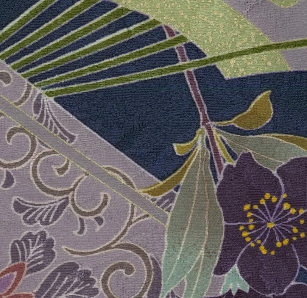 Traditional Japanese design elements are beautifully incorporated through geometric fans and circular medallions that punctuate the composition, providing structured counterpoints to the organic forms. The gold embroidery and metallic accents create luminous highlights that catch light dynamically, a technique that recalls both traditional Japanese craftsmanship and the gilded surfaces favored in Art Nouveau decorative arts.