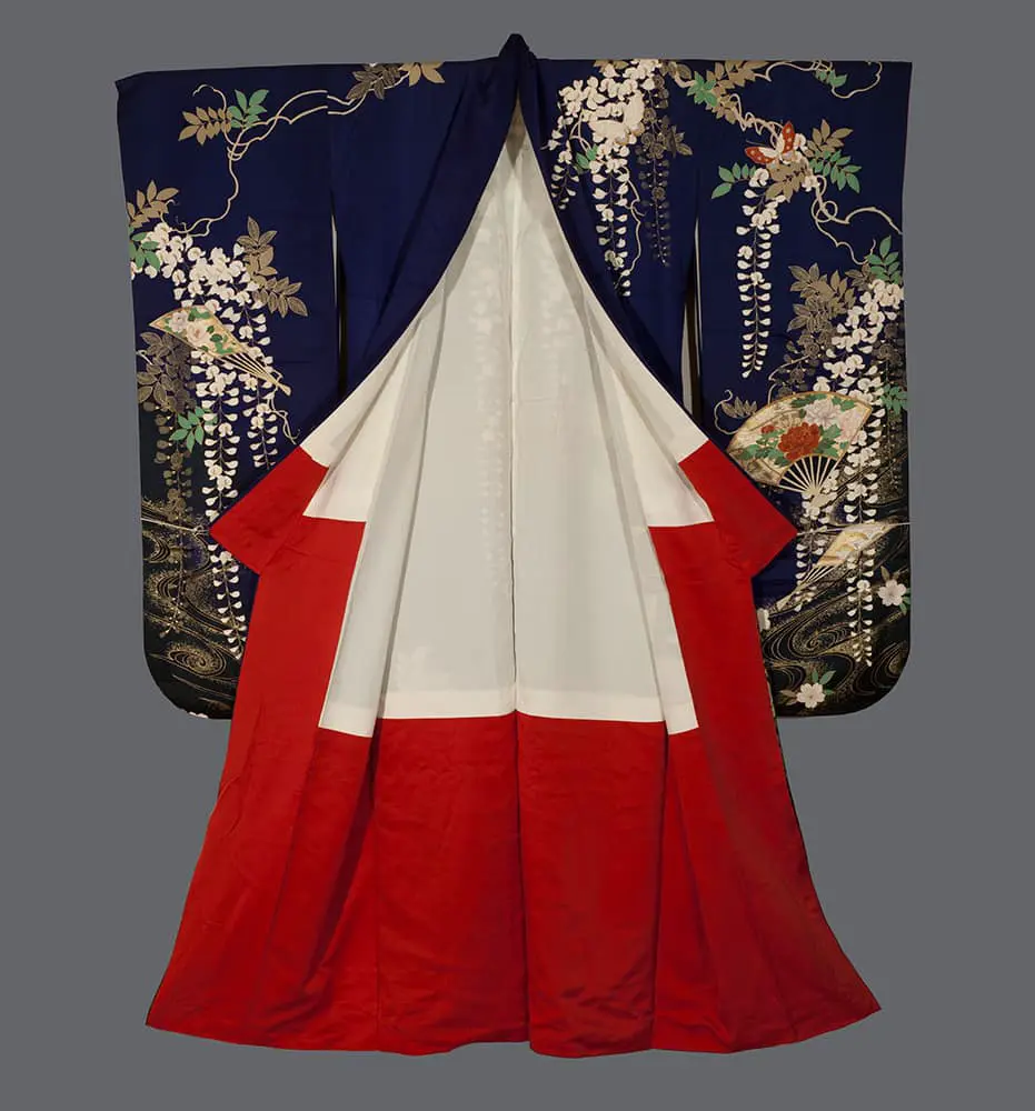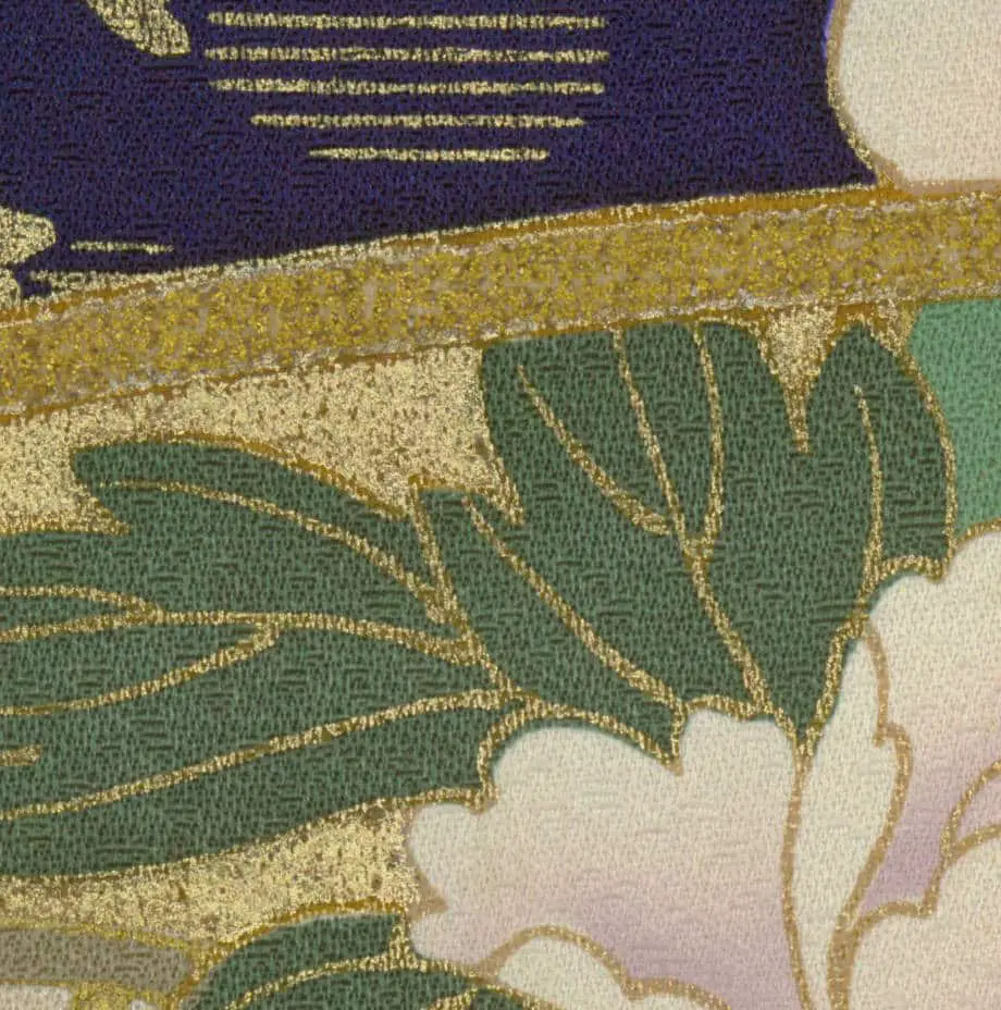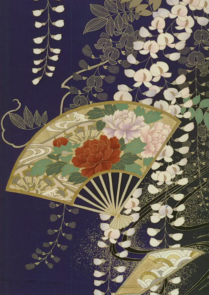 This late 20th-century silk furisode represents the culmination of traditional Japanese textile artistry, presenting a symphonic composition that celebrates the full spectrum of classical seasonal beauty through masterful yuzen-painting and lavish gold foil application. The deep navy ground serves as a dramatic stage for an elaborate procession of motifs that span the Japanese aesthetic calendar - cascading wisteria suggesting late spring's gentle melancholy, cherry blossoms embodying ephemeral beauty, peonies representing summer's lush abundance, and plum blossoms heralding winter's promise of renewal. The addition of decorative fans and flowing stream patterns creates layers of cultural reference, with the fans suggesting refined courtly leisure and the water motifs providing visual continuity that unifies the diverse floral elements into a coherent landscape of luxury.