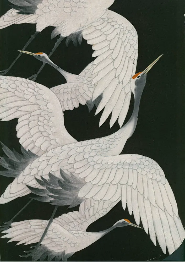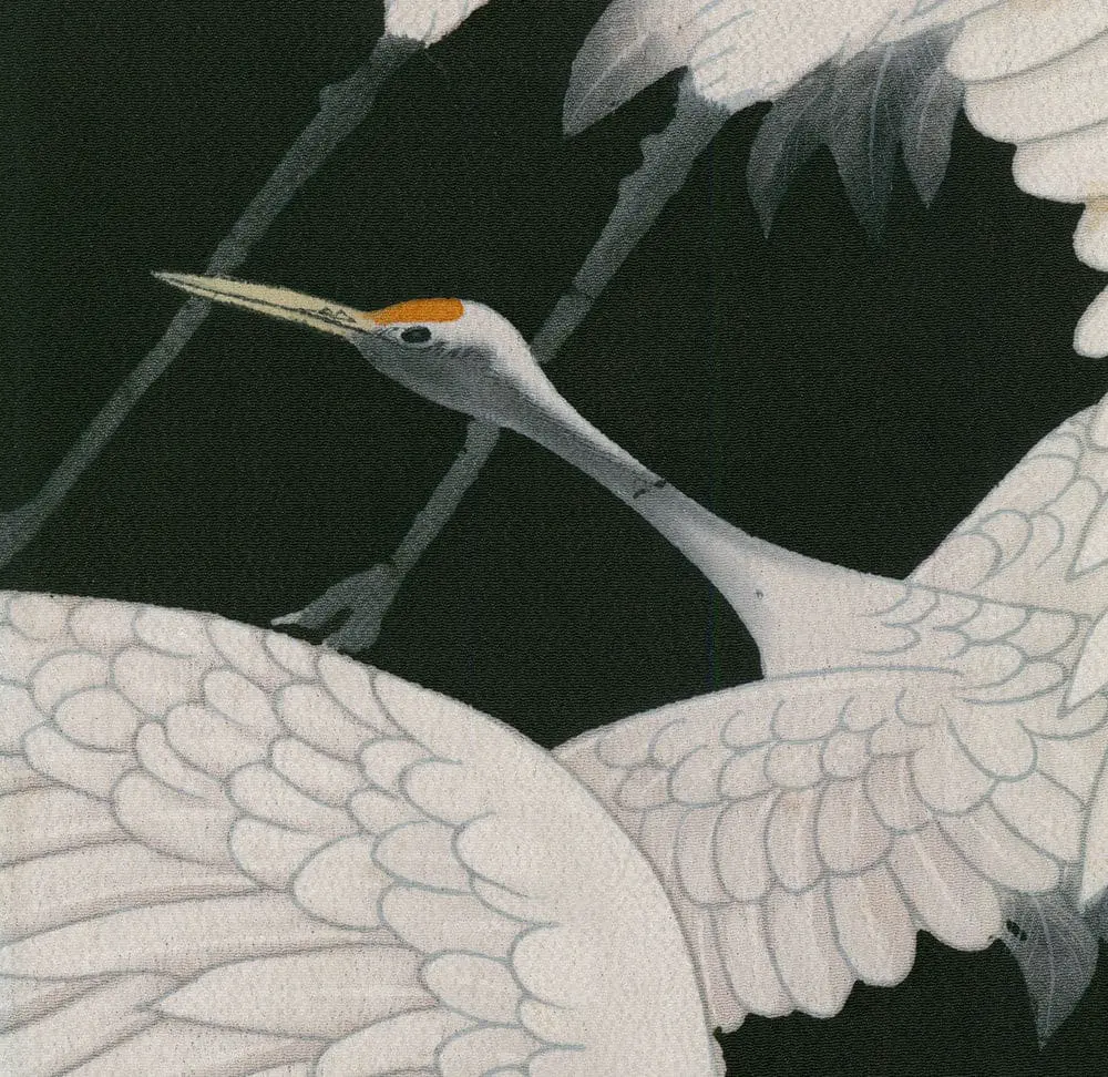 The use of black silk was the height of formal elegance for unmarried women, and the chirimen crepe silk would have provided a subtle textural richness that enhanced the luminous white of the painted cranes.